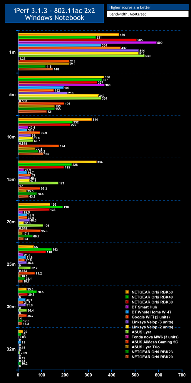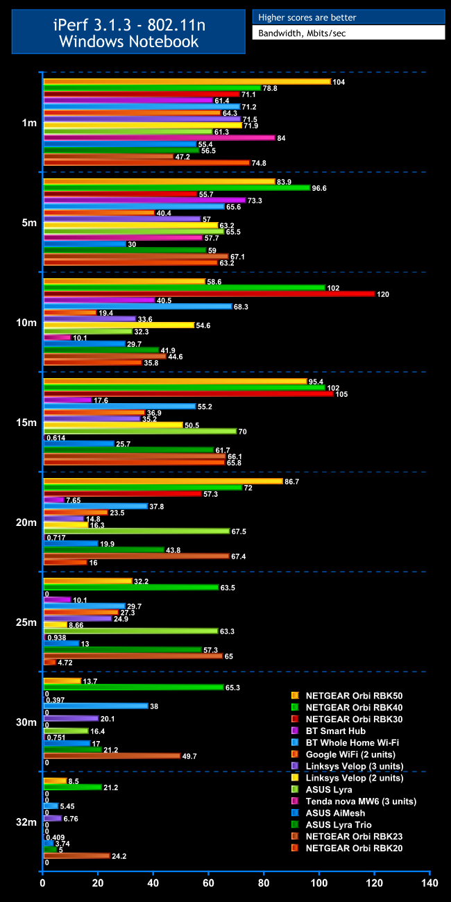 Within 1m, the NETGEAR Orbi RBK23 and RBK20 are clearly having some issues with interference from a neighbour's WiFi or the beam shaping isn't doing its job, with just 116Mbits/sec for the RBK23 and 148Mbits/sec for the RBK20. However, as range increases the relative performance improves commendably.