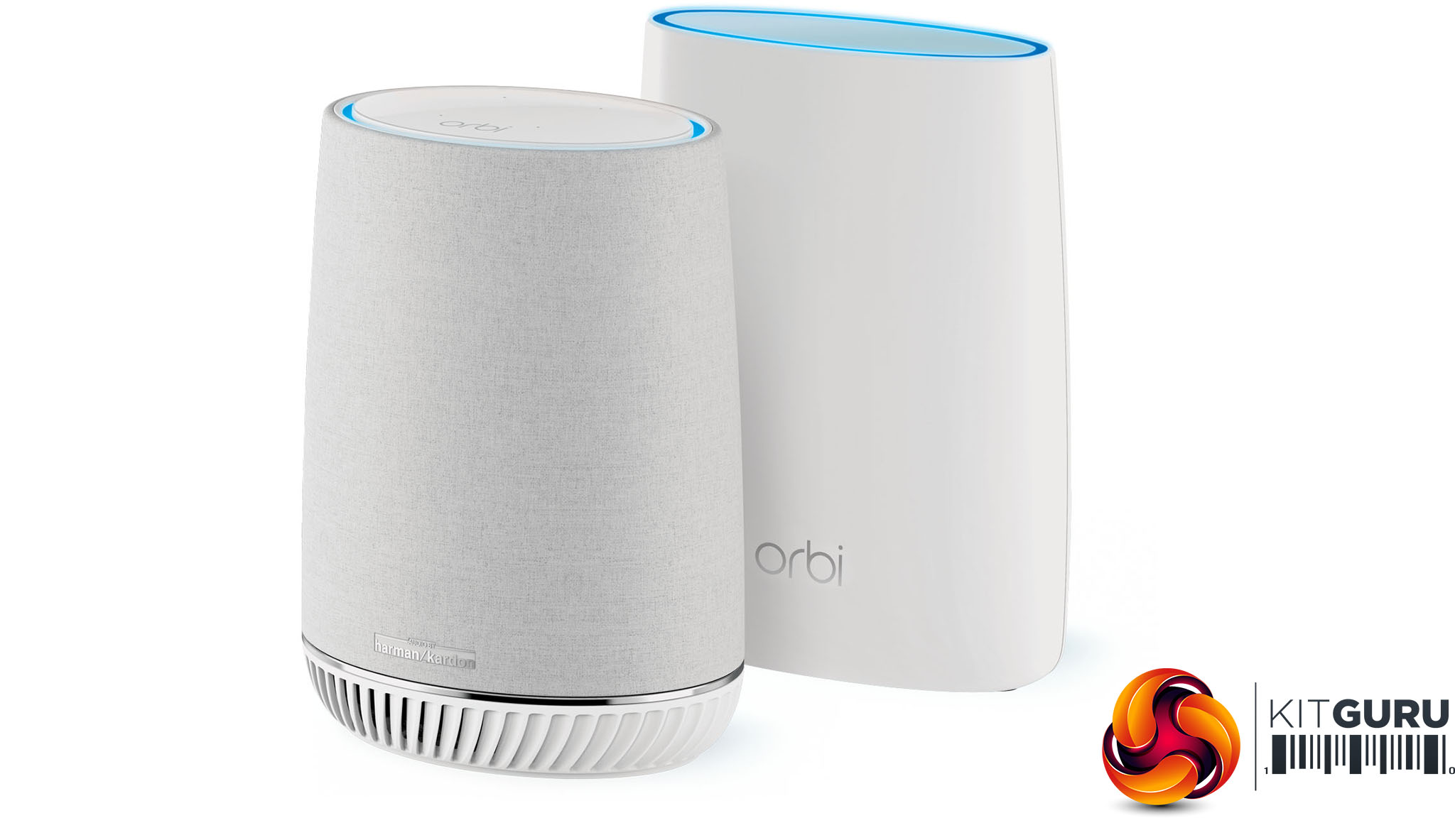 The RBS40V looks similar to the RBR50 router, but with an open grille at the bottom for the subwoofer, and grey speaker-style fabric over the main body.