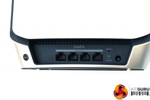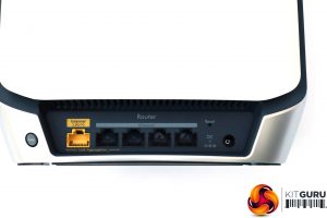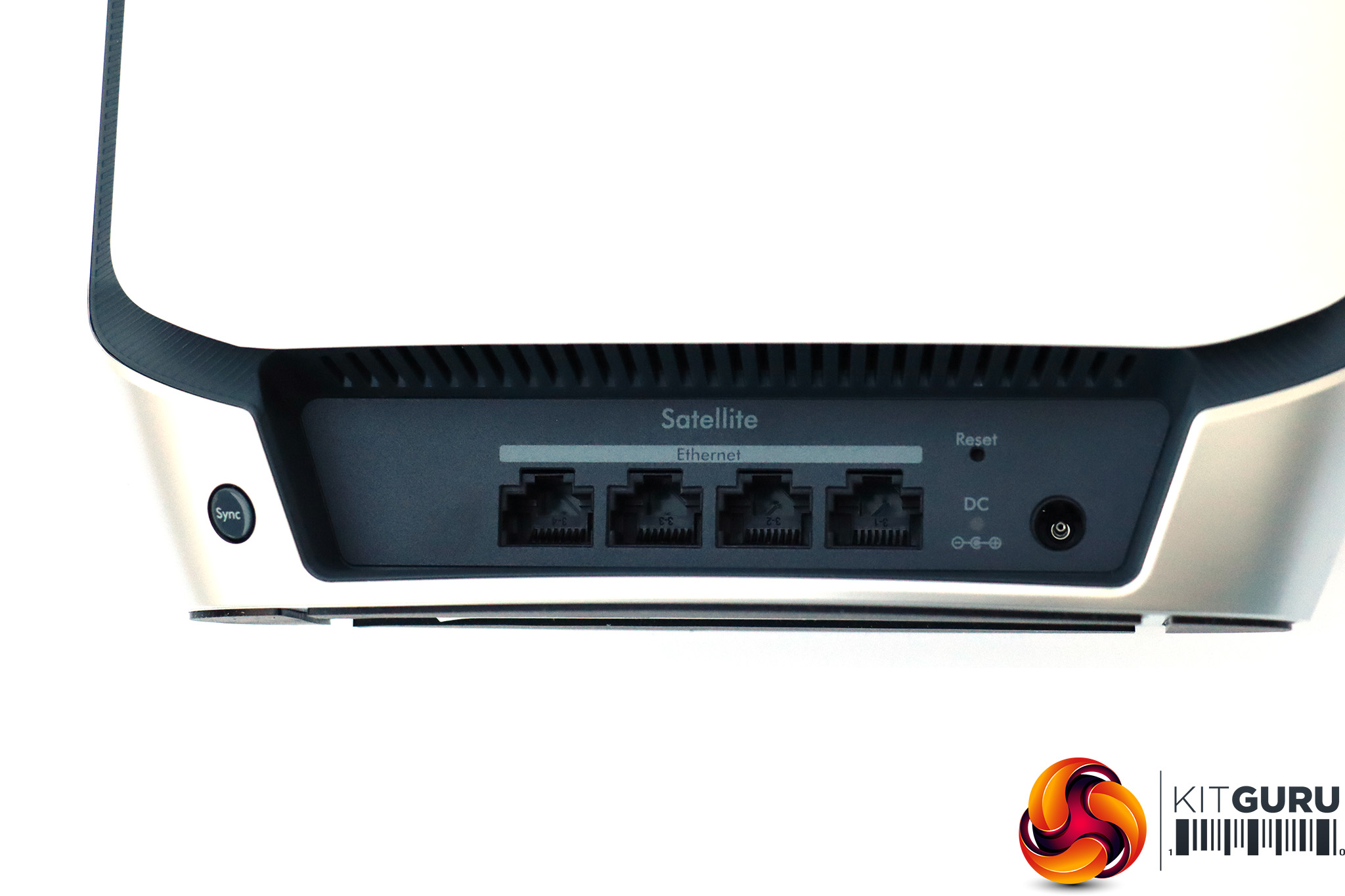 The router and satellite look virtually the same. The only indication of their difference is when you peruse the ports on the rear at the bottom. The yellow port on the left end of the router is the 2.5Gbit WAN connection, followed by four Gigabit Ethernet ports for wired devices. The Gigabit Ethernet port next to the 2.5Gbit port can also be aggregated with it for load balancing or doubling performance when you don't have a 2.5Gbit connection downstream. The satellite just has the four Gigabit Ethernet ports. With the high-speed backhaul, you could genuinely use the satellite to bring wired networking and broadband connectivity to an office that wasn't where your broadband comes in.