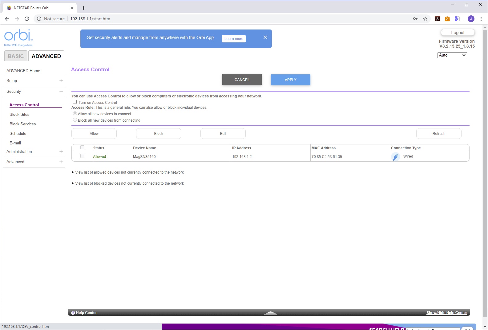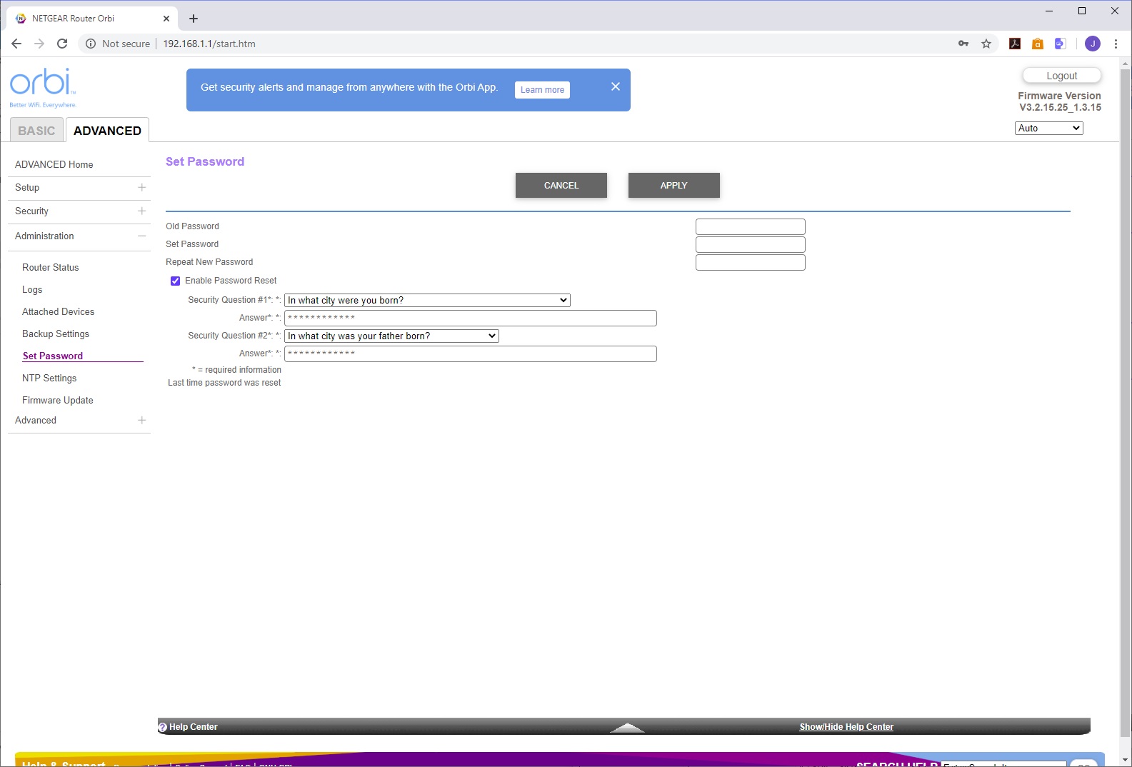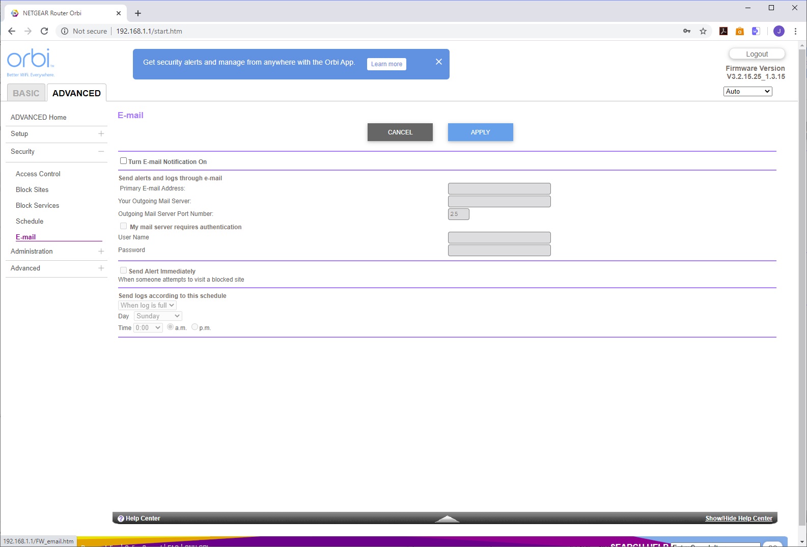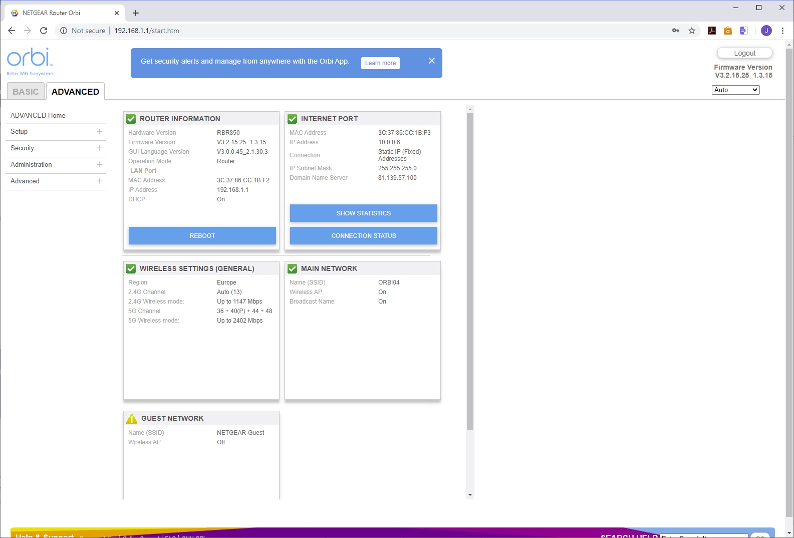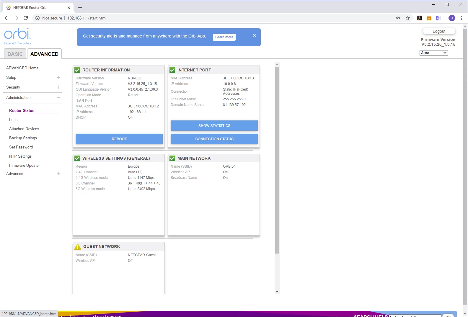 The Administration section provides further access to the Router Status overview. You can choose which events are logged and send the results to an email (although this requires email notification to be turned on). You can view the devices on the network in the same way as in the Basic area. The router settings can be backed up and restored. You can also change the password and security questions. There's an NTP section for configuring how the time is automatically set, and with the last menu item you can update the firmware on the router and attached satellite.