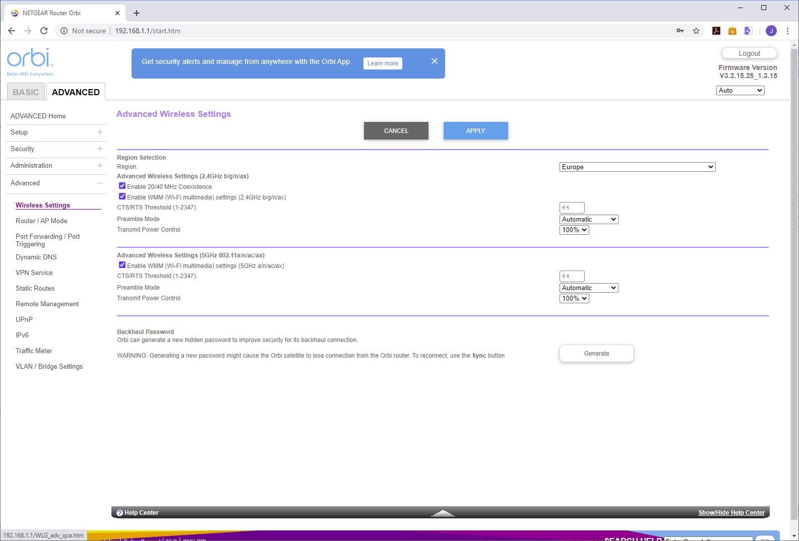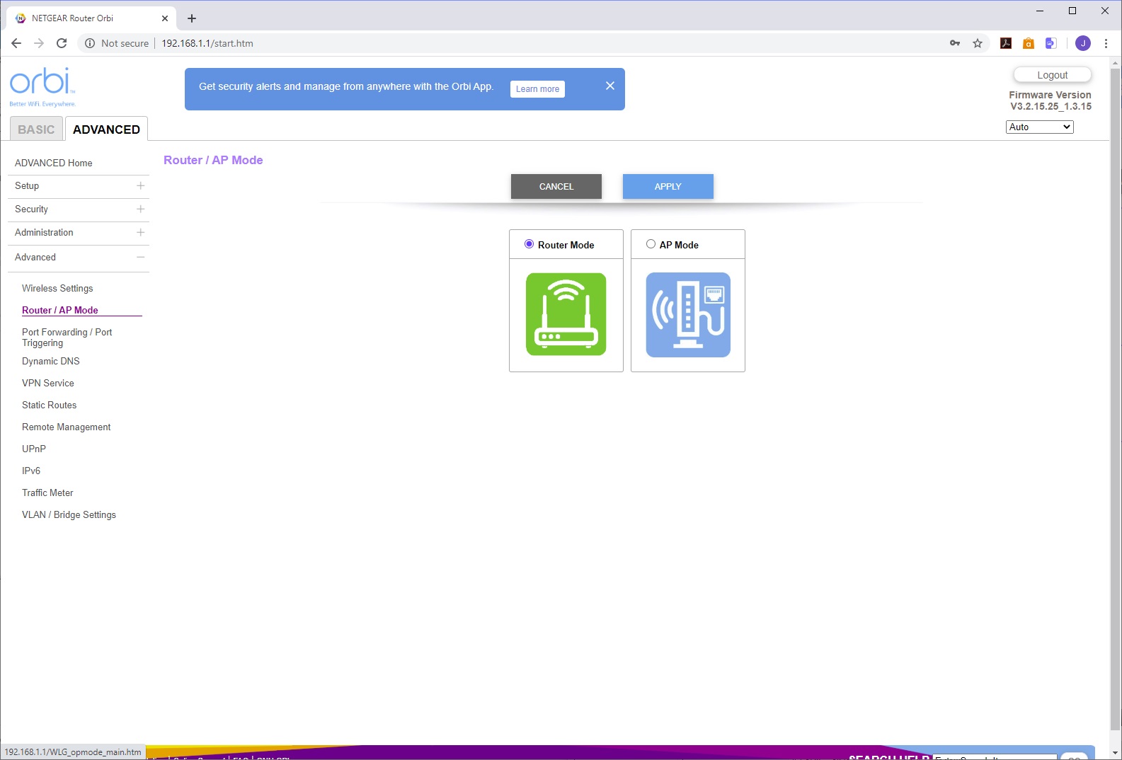 Finally, in the Advanced section of the Advanced tab, you get even more specialist settings for the WiFi, such as enabling 20/40MHz coexistence in the 2.4GHz band, and WMM (Wi-Fi Multimedia) for 5GHz. You can switch the Orbi between router and AP mode. The usual port forwarding options are available so you can allow a specific port on an internal system to be externally accessible, such as a game server. You can set up dynamic DNS with NETGEAR's own system, No-IP or Dyn.