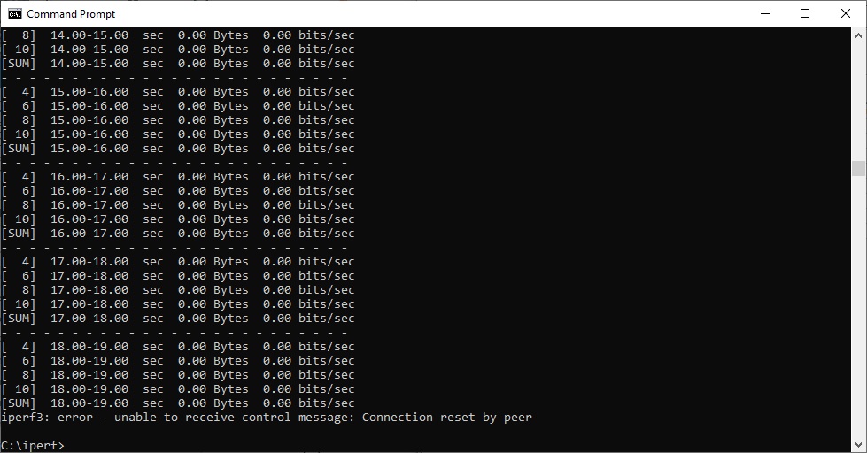 Note that the client command sends four streams of data simultaneously, simulating a multi-client connection as closely as possible with just one client. It takes 60 throughput readings at one second intervals and then averages the result.