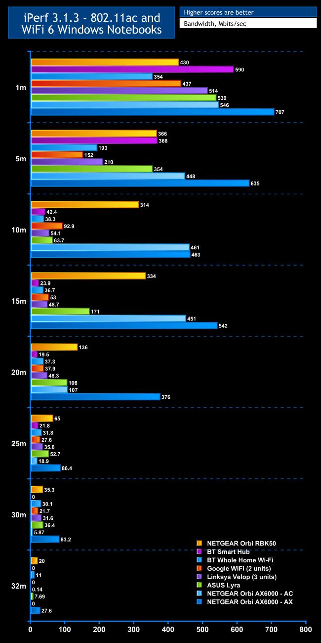 Within 1m, the NETGEAR OrbiAX6000 puts up a good showing with 802.11ac, hitting 546Mbits/sec, which is amongst the best close range results we've seen. But in WiFi 6 mode, the bandwidth increases to 707Mbits/sec, which is on par with the non-mesh WiFi 6 NETGEAR Nighthawk AX12.
