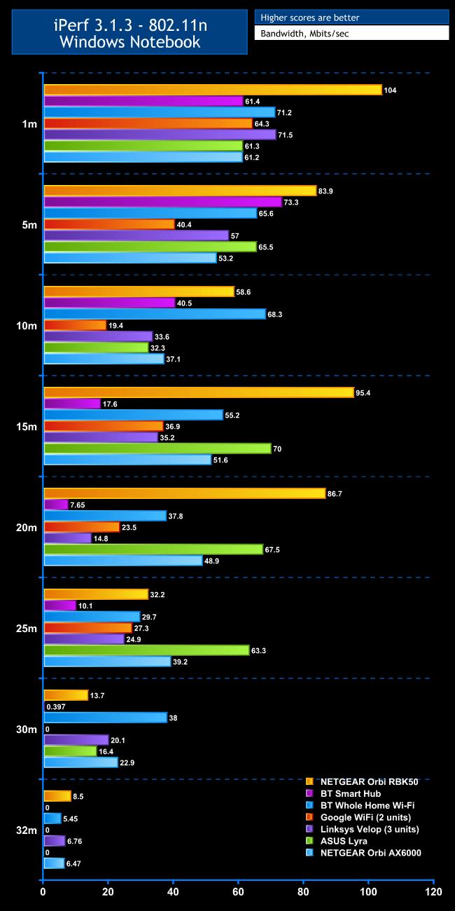 The picture with 2.4GHz 802.11n is much more pedestrian than with 5GHz 802.11ac and ax. The AX6000 only manages a run-of-the-mill 61.2Mbits/sec at 1m, and at 5m bandwidth is a fairly miserly 53.2Mbits/sec.