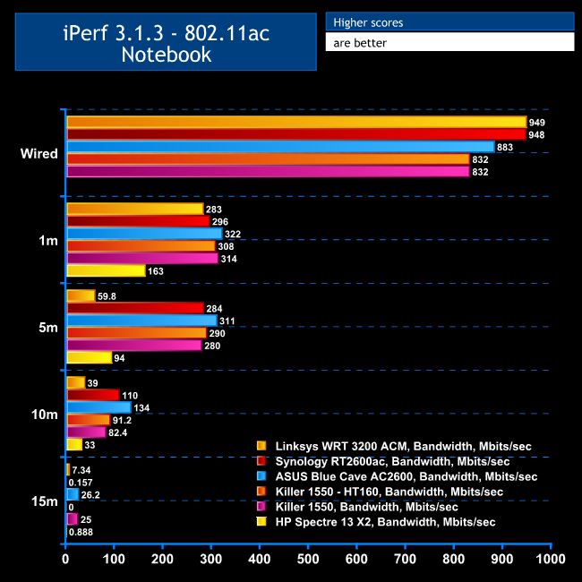 The Killer 1550 is clearly an excellent WiFi client chipset, however, as the HP notebook wasn't coming close to the same throughput.