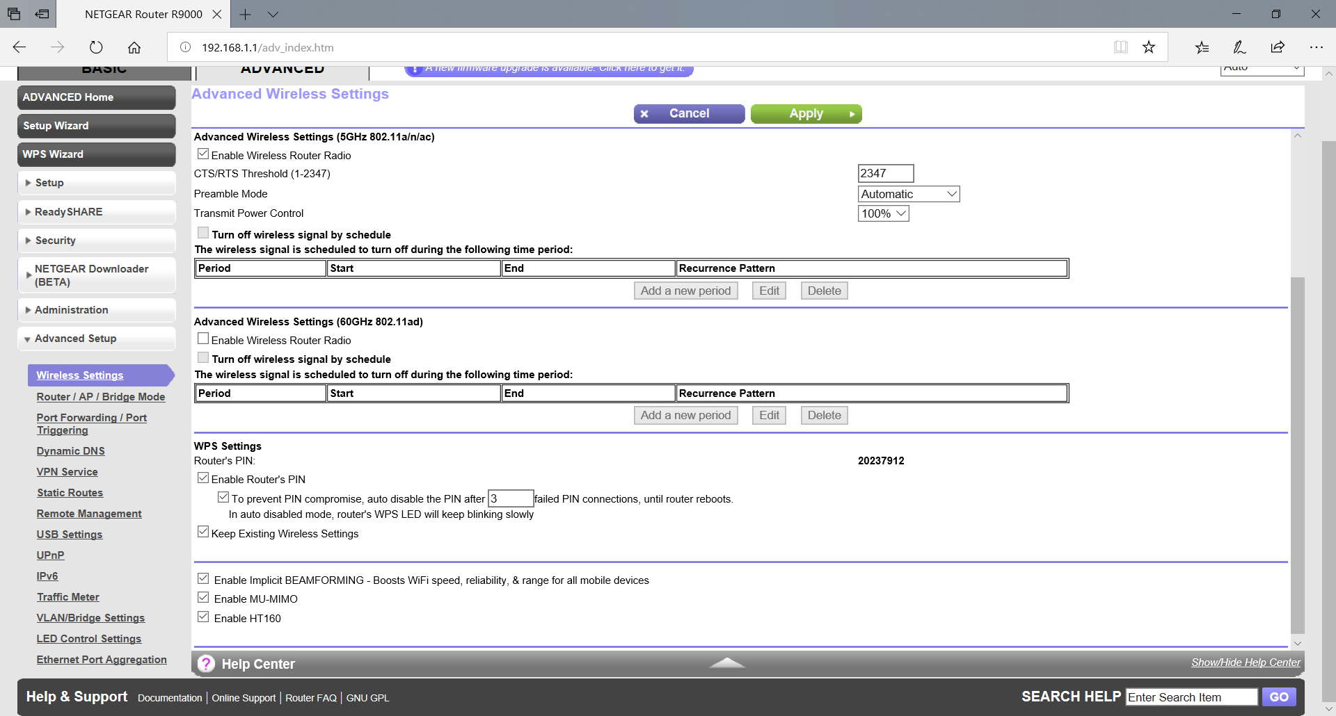 We configured the NETGEAR Nighthawk X10 R9000 with HT160 enabled as shown above, which turns on the potential for 160MHz channels. But we then disabled this to test the Killer 1550 again, and also when testing the HP Spectre 13 X2 notebook.