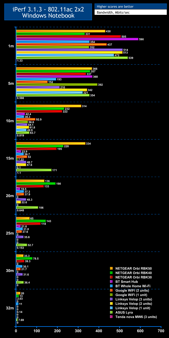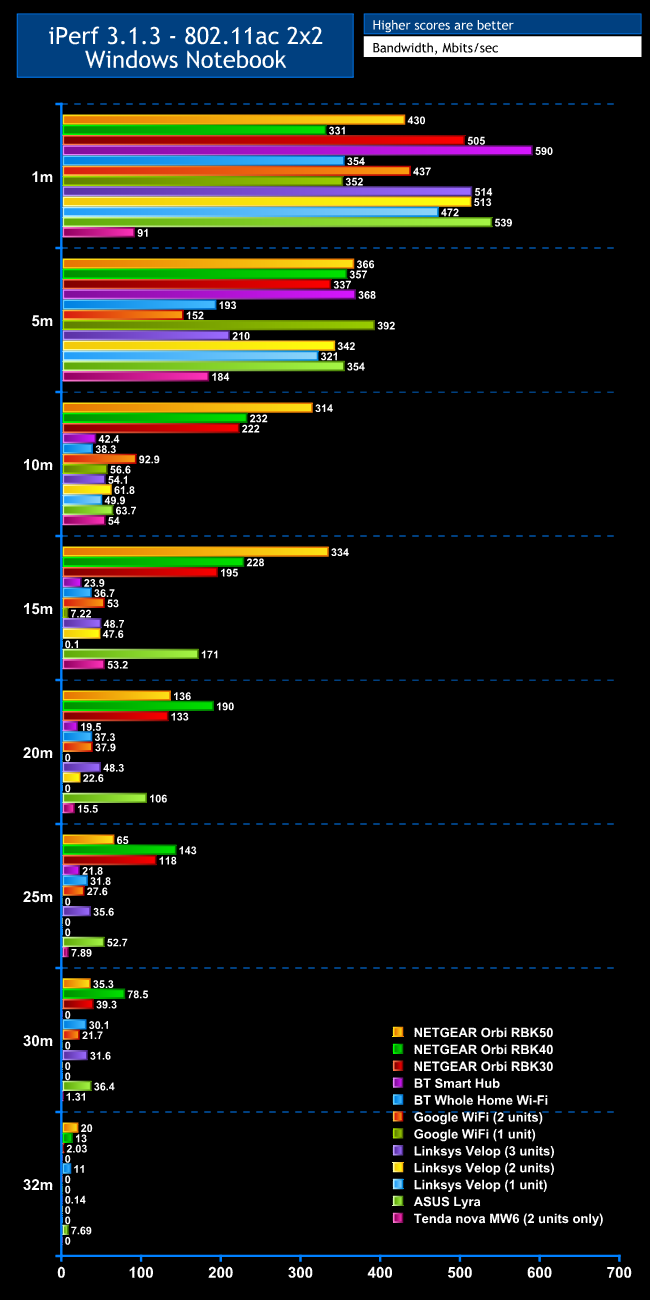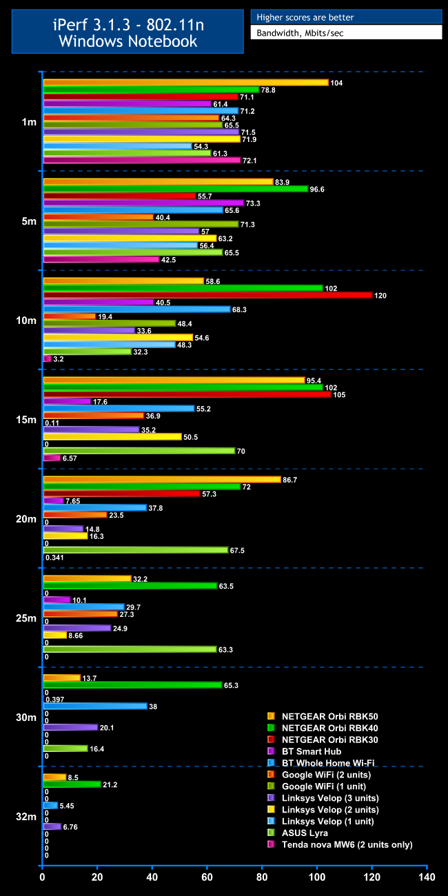 This is a little more encouraging than for 802.11ac, although performance still drops like a stone beyond 10m. The nova MW6 struggles on with a trickle of bandwidth to our maximum distance, but this is still just about the worst mesh WiFi system we have tested in terms of performance.