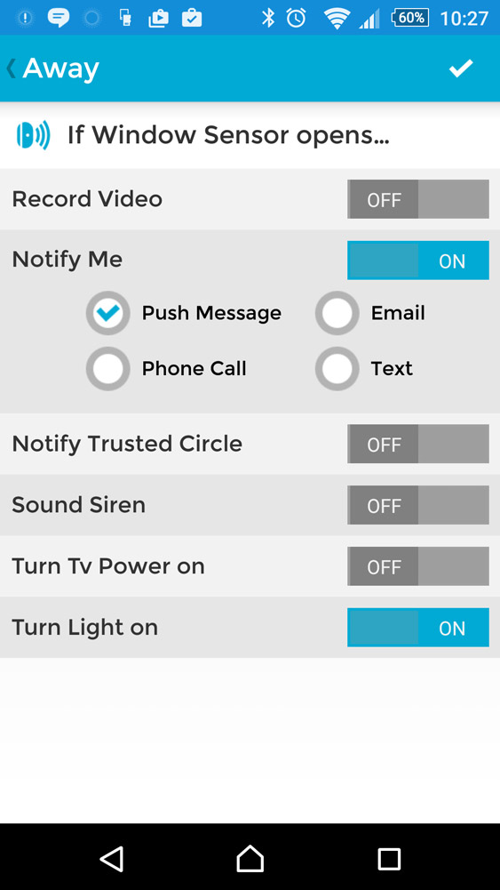 Each of the available options – stay, away and vacation – give you the same abilities, but let you choose different scenarios. Stay is for when you are in the house, where you likely do not need the alarm on, but you might want some automated temperature adjustment. Should it get too warm where the camera is located, you could have the bundled Z-Wave accessory automatically power on the air conditioning, or in the reverse case, an electric heater. Lighting could be triggered at a certain time of night or when the brightness in the room drops too low.