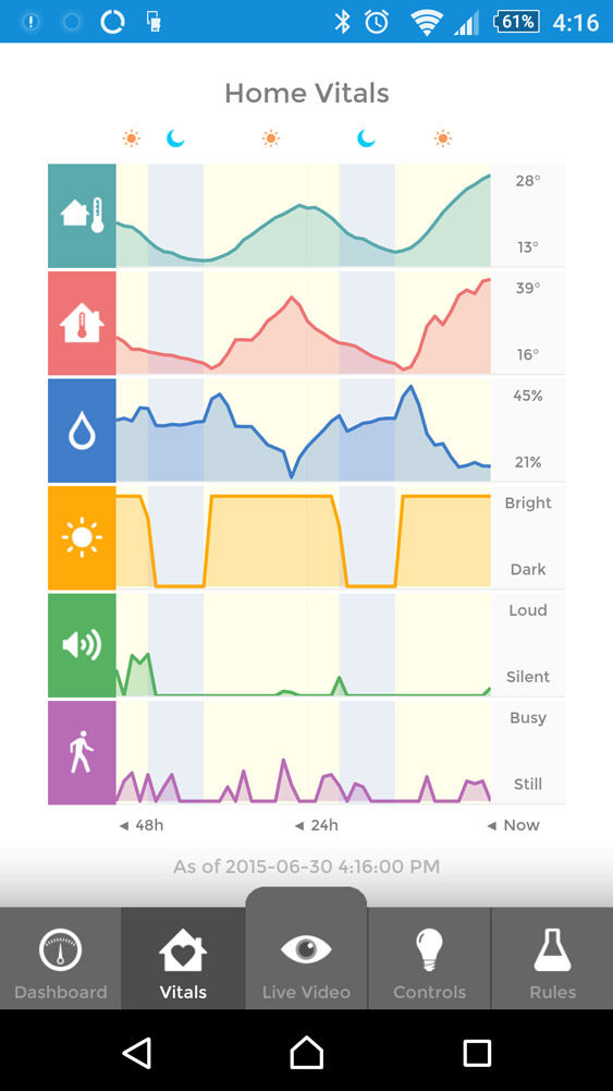System vitals can give you an idea about what your home is like throughout the day. There is a charted temperature for the outside and in, as well as humidity levels, brightness and motion related activity. This would be excellent for those that are continuously recording an area, as it would mean anything out of the ordinary should register, letting you jump to that select piece of footage rather than watching through every day to make sure nothing untoward has happened.