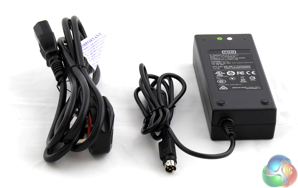 The most important accessory in the package is the power supply which has a UK power cord. In addition you get a handful of screws to fasten the 2.5-inch or 3.5-inch drives in their caddies.