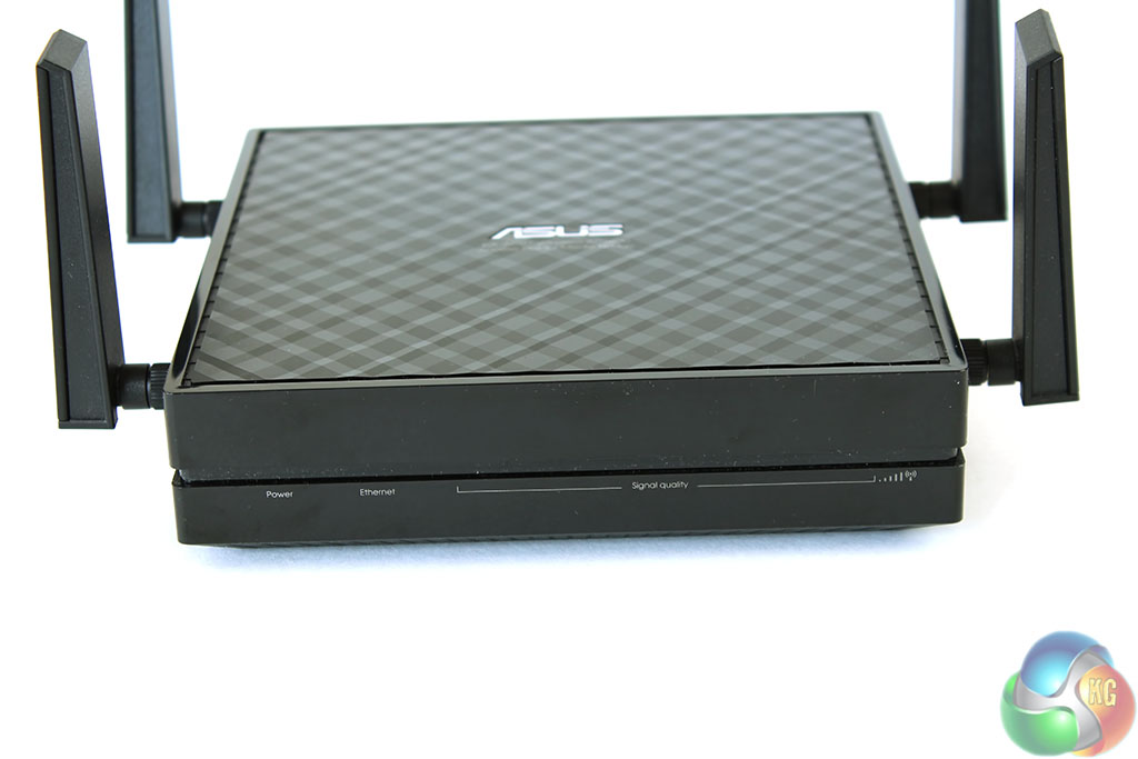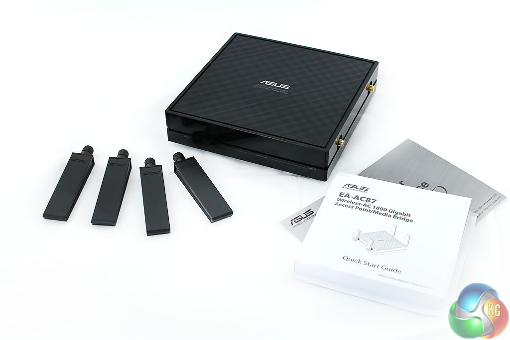 The package contains the unit itself, with the antennas supplied separately. It has the familiar Asus checkered pattern on the top, with a perfectly square design. There’s also a quick-start guide and warranty information, with a power adapter (not pictured).