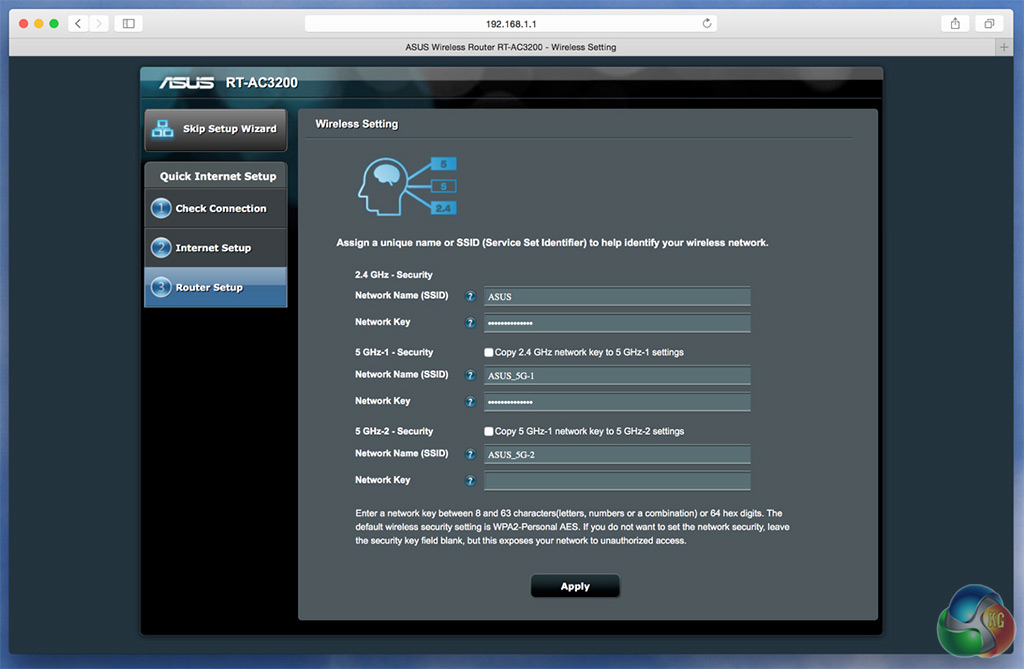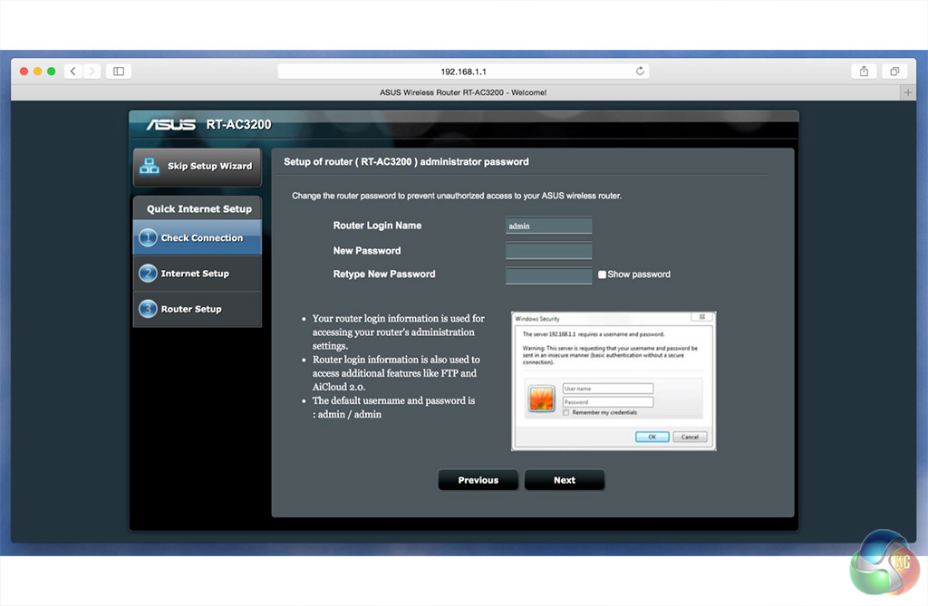 Although the RT-AC3200 provided internet connectivity to wired clients as soon as we plugged them in, when you first access the router software, you need to go through a short setup sequence to set a wireless password and create a user account.