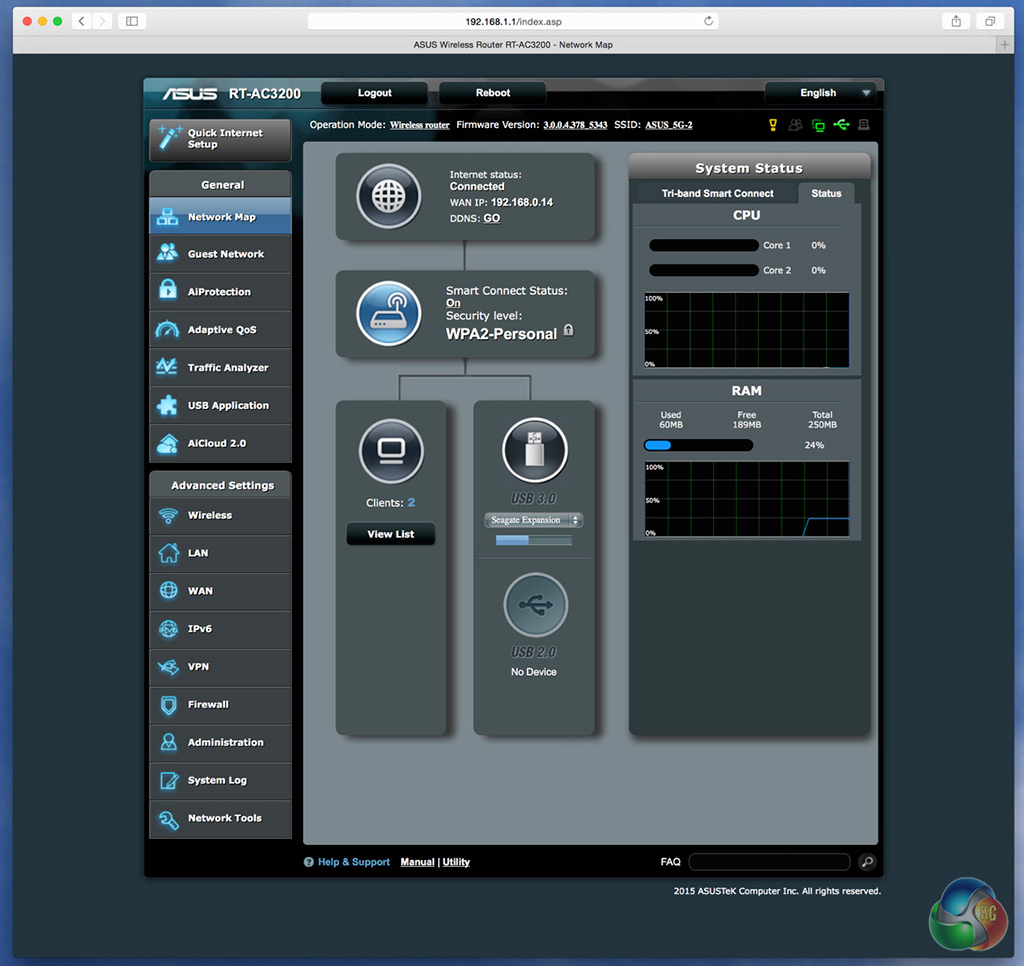 The SSIDs are listed at the top, and underneath it you’ll see the WAN IP, a client list, and a quick view of any connected USB devices. On the right is all the necessary info for the wireless networks. Click the ‘Status’ tab for graphs showing real-time CPU and memory usage.