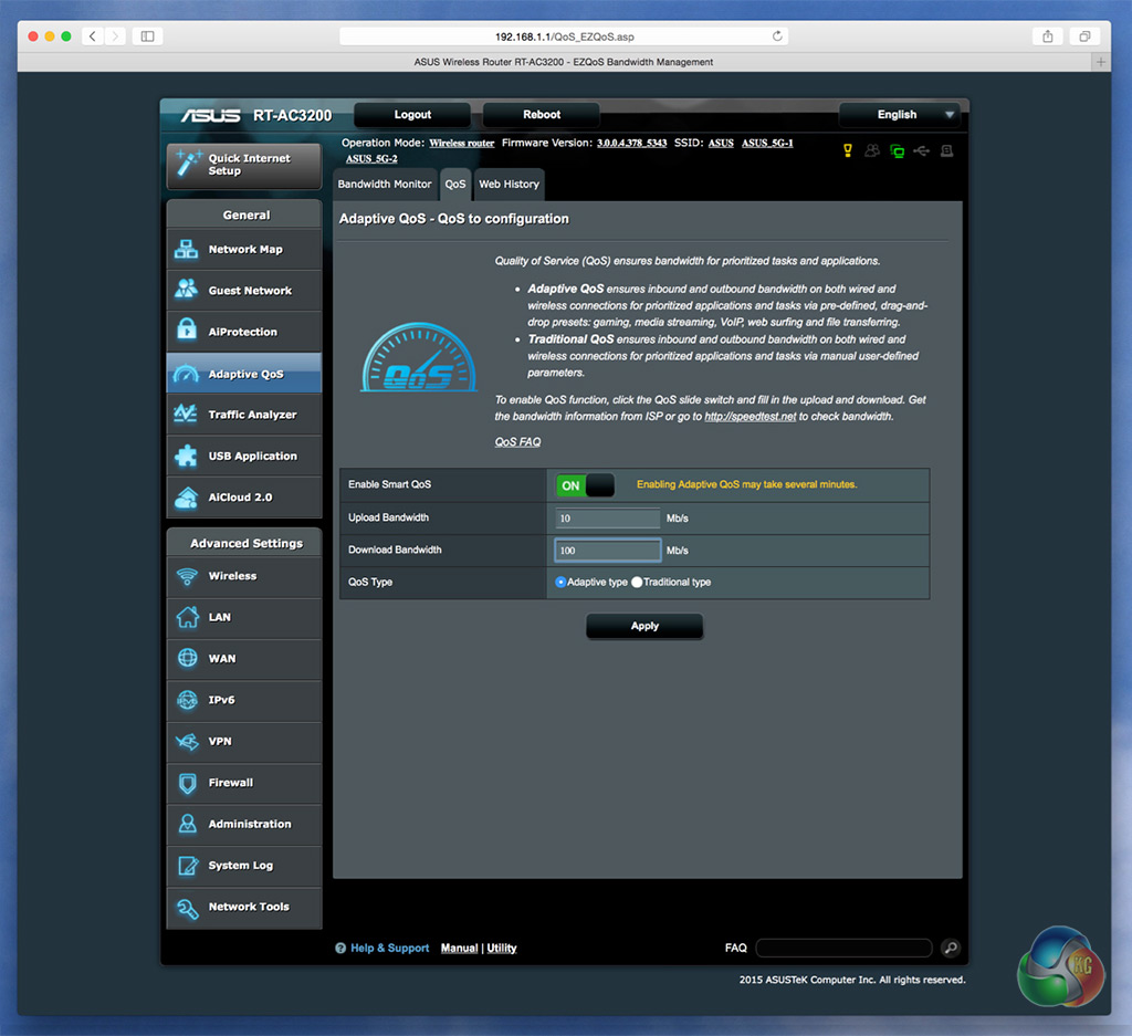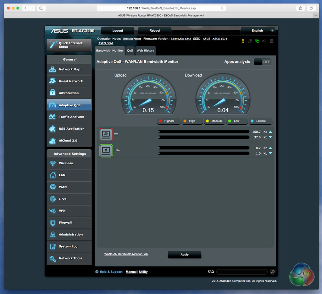 The ‘Adaptive QoS’ screen shows the total amount of internet bandwidth being consumed, with a real-time breakdown of how much data each device on your network is consuming. You can prioritise devices by dragging coloured labels over the name of each client.