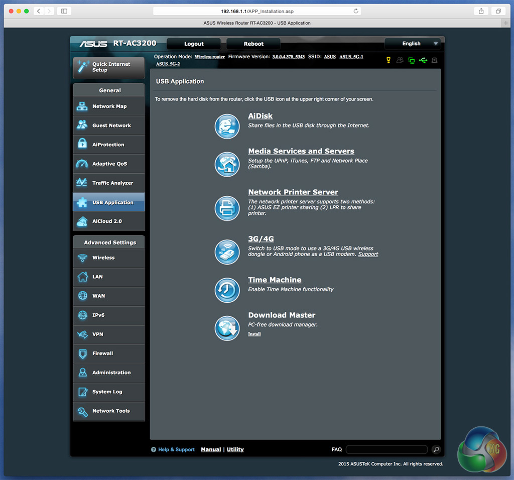 The ‘USB Application’ screen gives you a submenu of six settings for connected USB devices: AiDisk, Media Services, Network Printers, 3G/4G modems, Time Machine (for Macs) and Download Master, the on-board Torrent software, used if external storage is connected.
