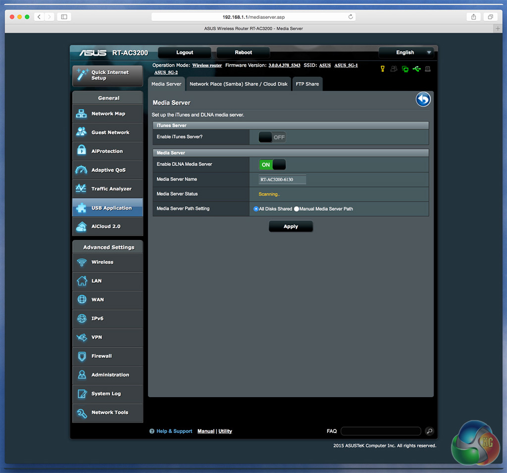 The Media Server option provides settings for an iTunes server, DLNA, cloud sharing and FTP sharing.