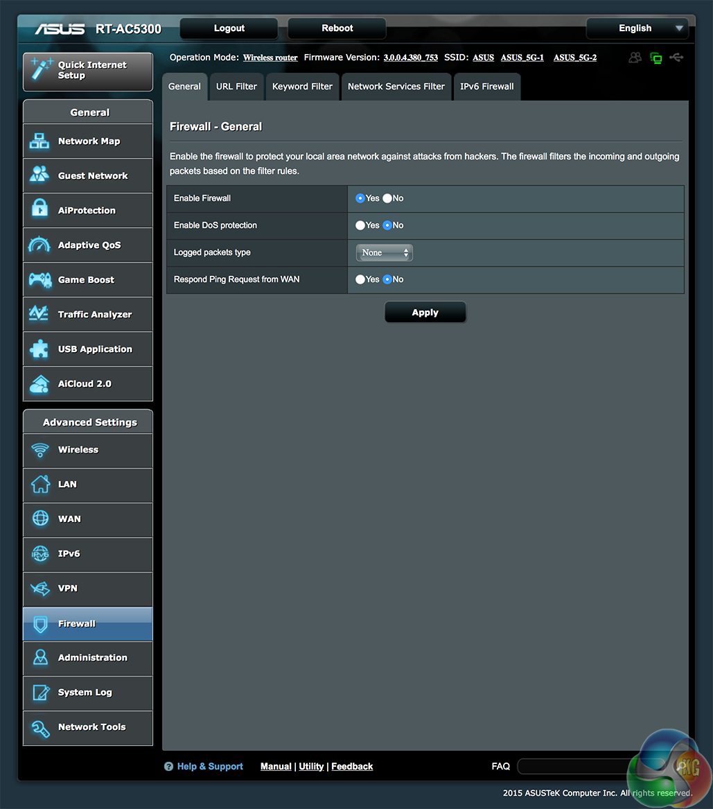 The firewall allows for packet logging and DoS protection, and blocking URLs, keywords and specific network services.