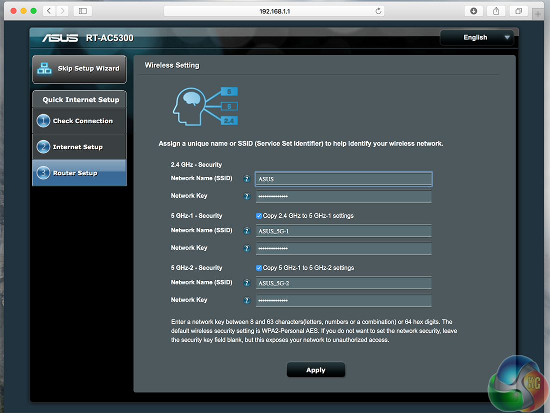 When you first connect to the Asus RT-AC5300 it takes you through a simple process of creating passwords for the wireless networks and the router itself.