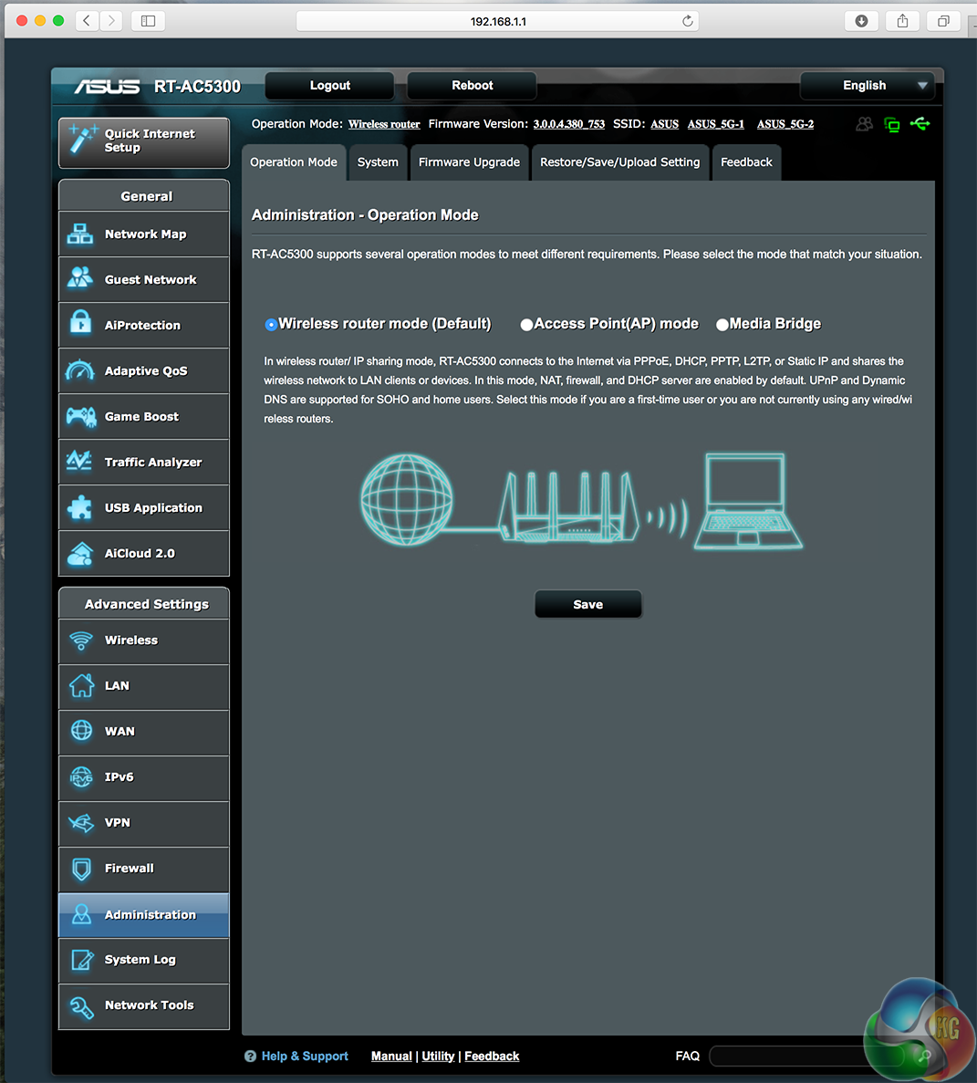 In the Administration page is the setting to set the RT-AC5300 up as a wireless bridge, or access point. The tabs at the top lead to firmware updates, system settings including password resets and assigning static IP addresses.
