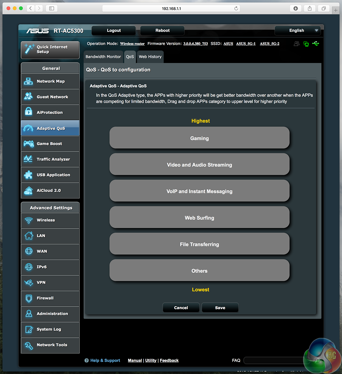 The QOS settings are very easy to use, which is just as well as this can be confusing for novices to set up. Select a client and allocate them a priority (a colour). Or, if you can’t be bothered with this, just choose a preset.
