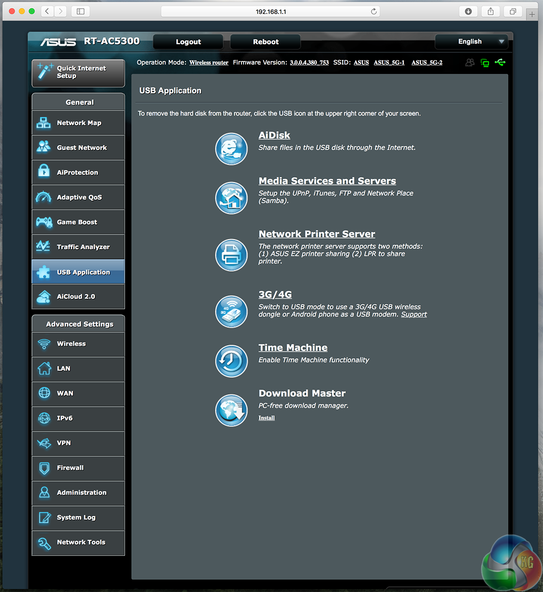 With external storage connected to either USB port, you can set up AIDisk, allowing sharing of files to a personal cloud system like on many NAS devices. There’s a torrent manager, and a number of media services such as an iTunes server or FTP.