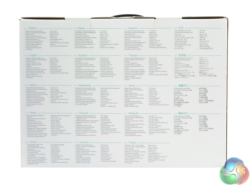 The front of the box features an image of the AS3104T, a panel containing the hardware specifications and a line of icons displaying what the NAS can be used for. The rear of the box is covered by multilingual resumes of some of the device's features.