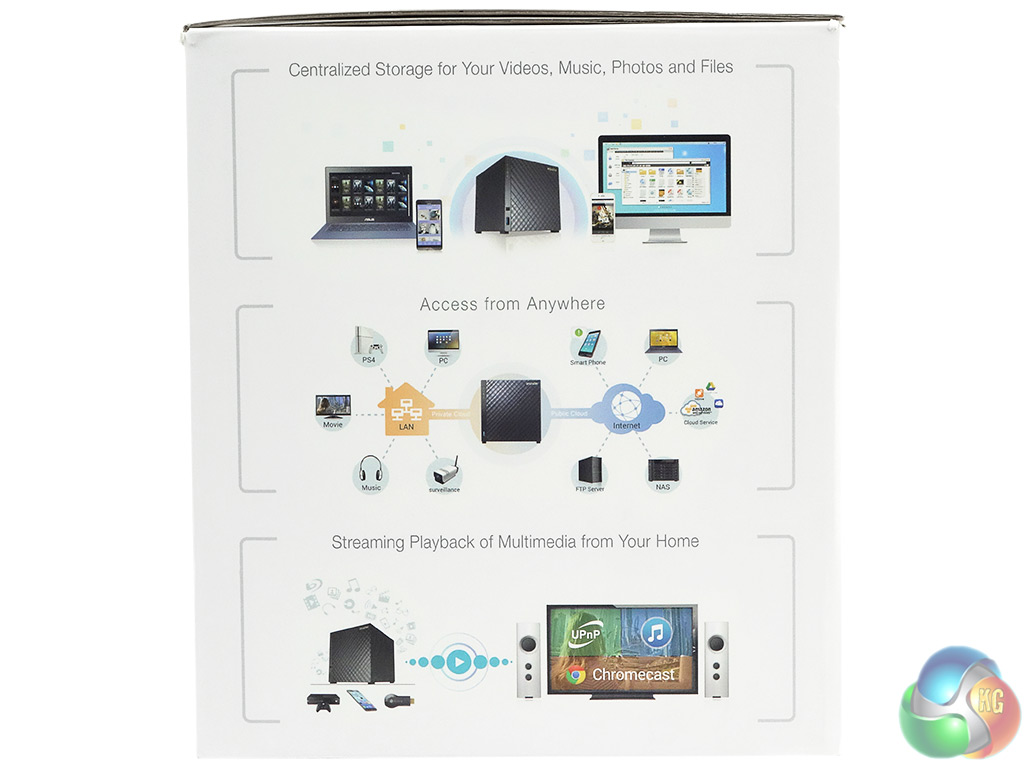 One side of the box has a walkthrough of how to use the Asustor AiMaster app to configure the AS3104T using a tablet or smartphone. There are also descriptions of Photo Gallery, LooksGood (video) and SoundsGood (audio) apps.