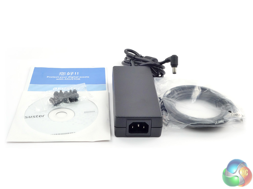 The box bundle that comes with the AS3104T contains everything you need to get the unit up and running; 90W Delta Electronics power supply, Ethernet cable, enough thumbscrews to mount four drives, a quick start-up guide, and an installation CD.