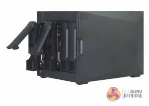 The AS4004T uses a tool free system to hold the hard drives in place. Two plastic strips with built-in pins fit into the sides of the drive tray with the pins pushing through a vibration deadening grommet into the hard drive sides. It's simple but very effective.