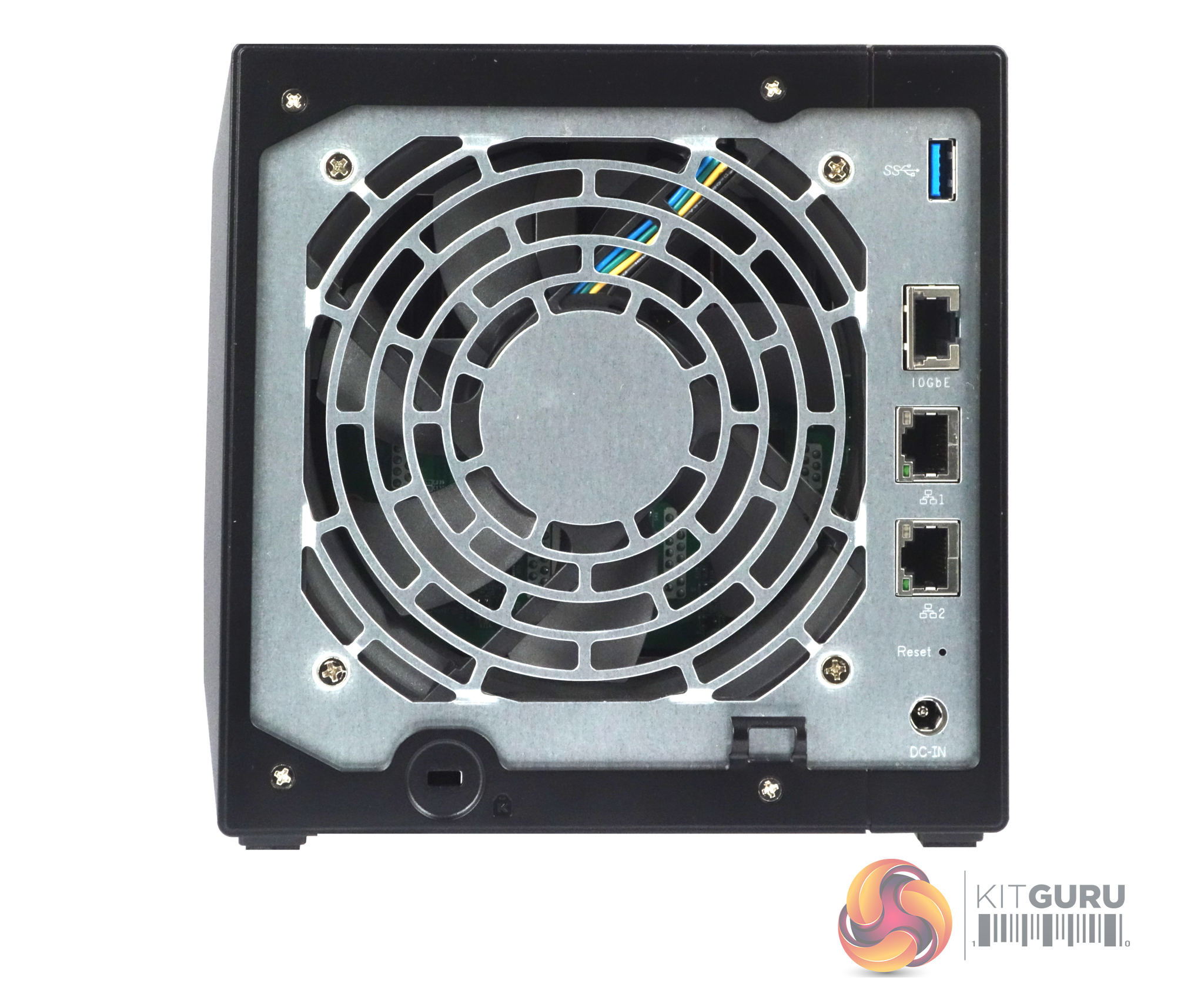 The rear panel of the NAS is dominated by the grill for the 120mm cooling fan. To the right of this are all the ports; dual 1GbE, single 10GbE and a single USB 3.1 port.