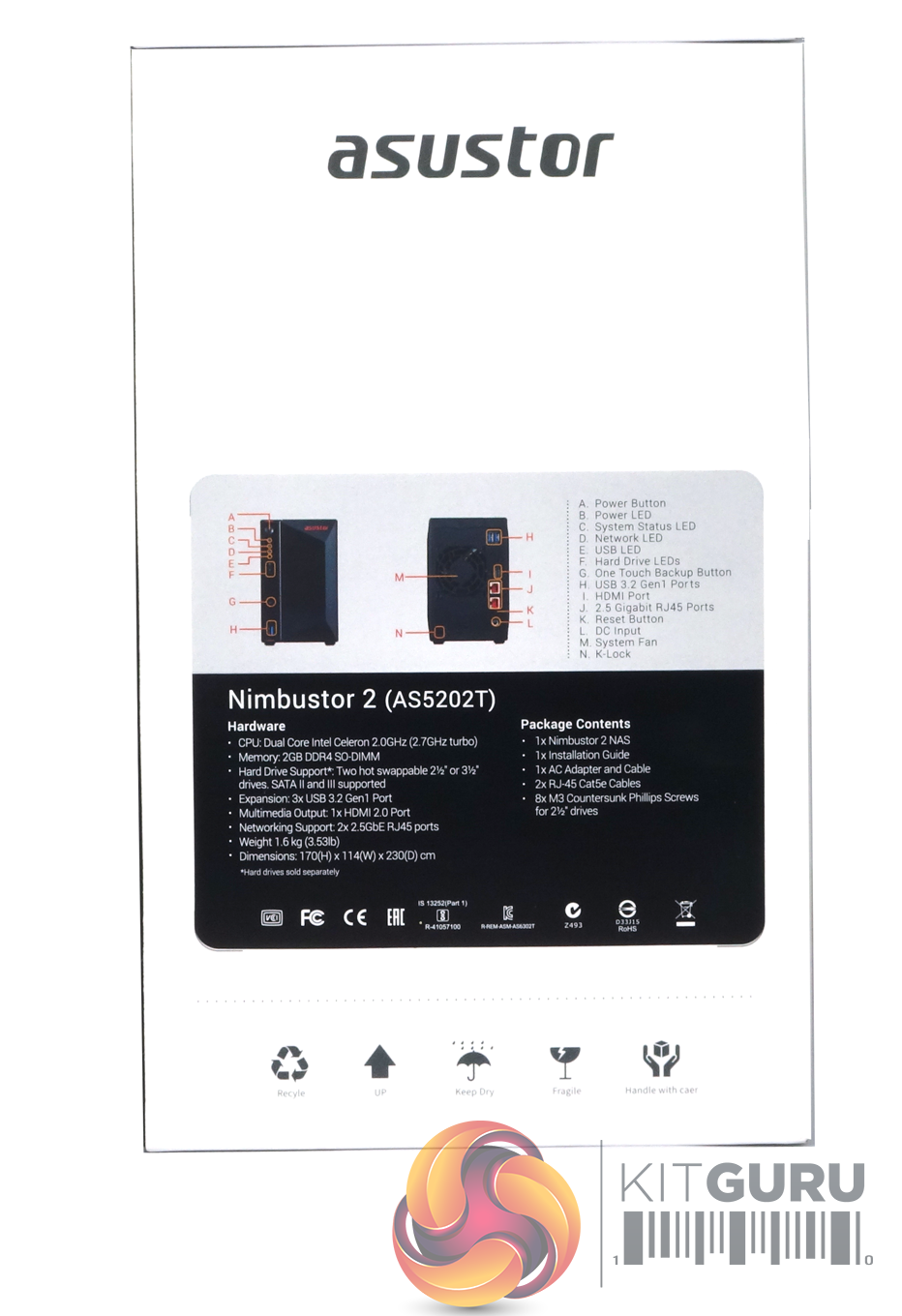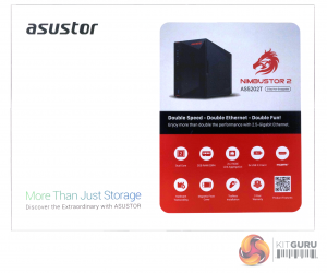 The AS5202T comes in a compact box. The front of the box has a large sticker on it displaying an image of the drive along with the model number and dragon head Nimbustor logo.
