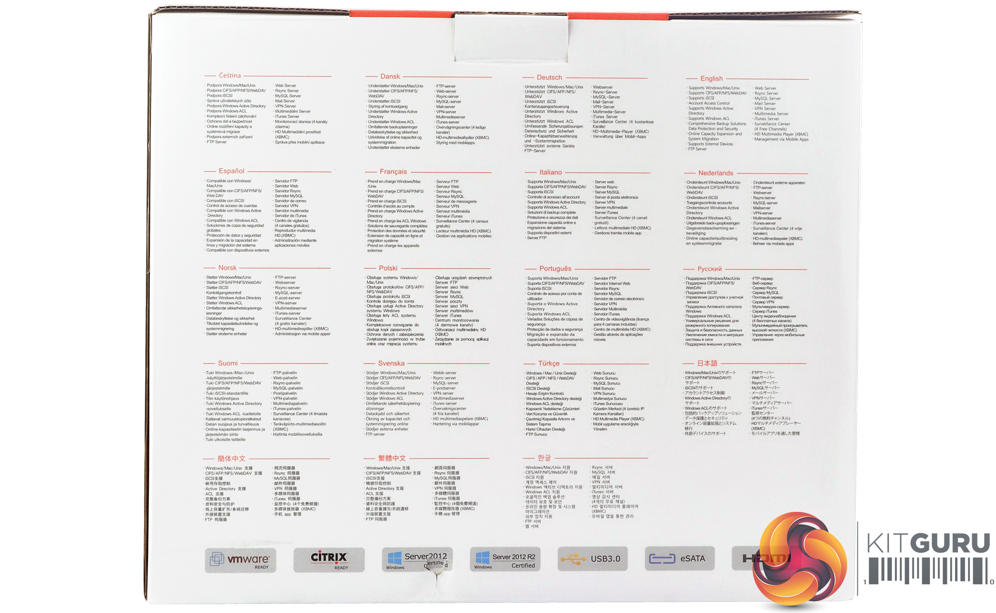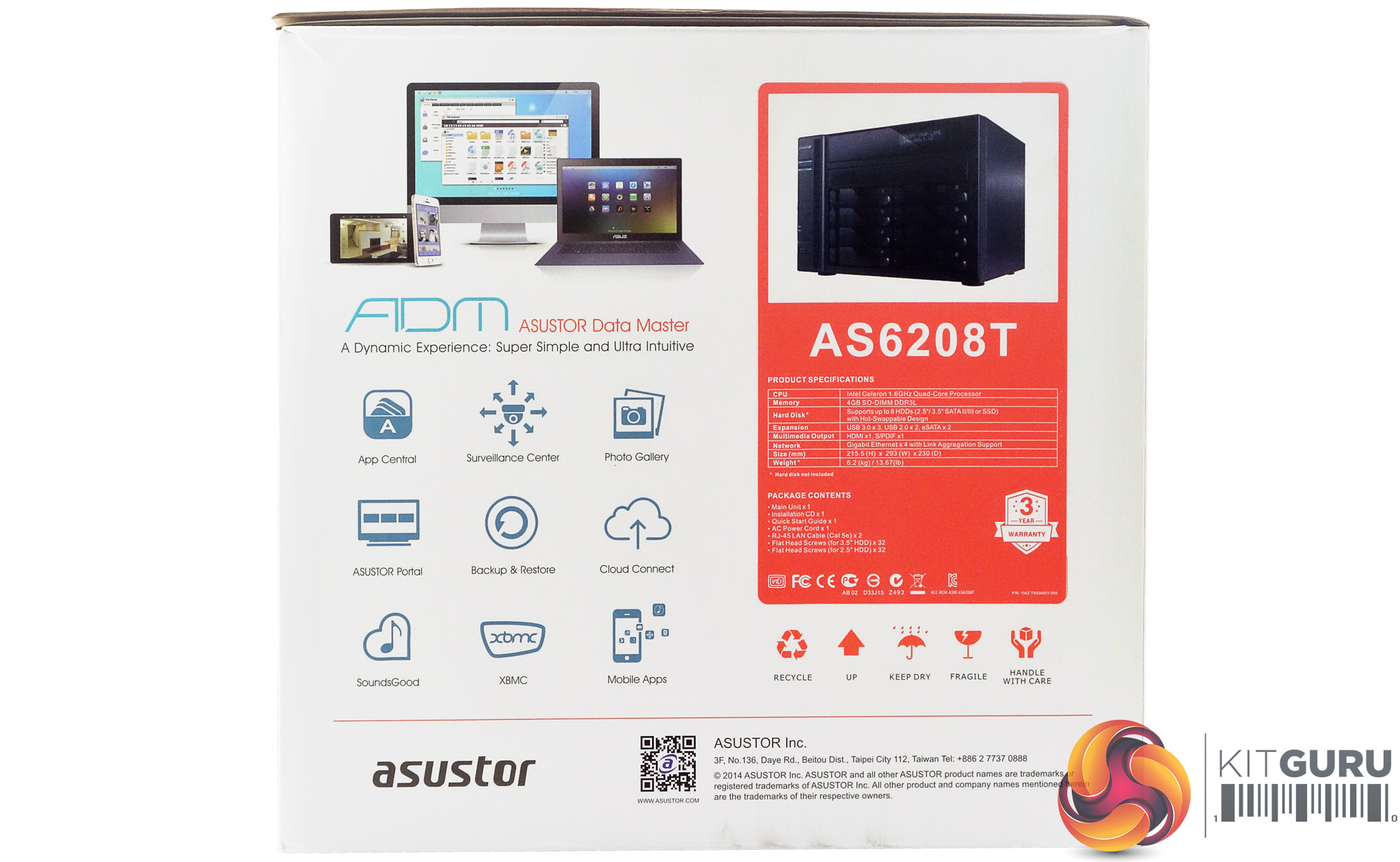 The other box side displays a more detailed specification box for the AS6208T and a list of what is the box. There's also a graphic of some of the ADM (Asustor Data Master) OS features.