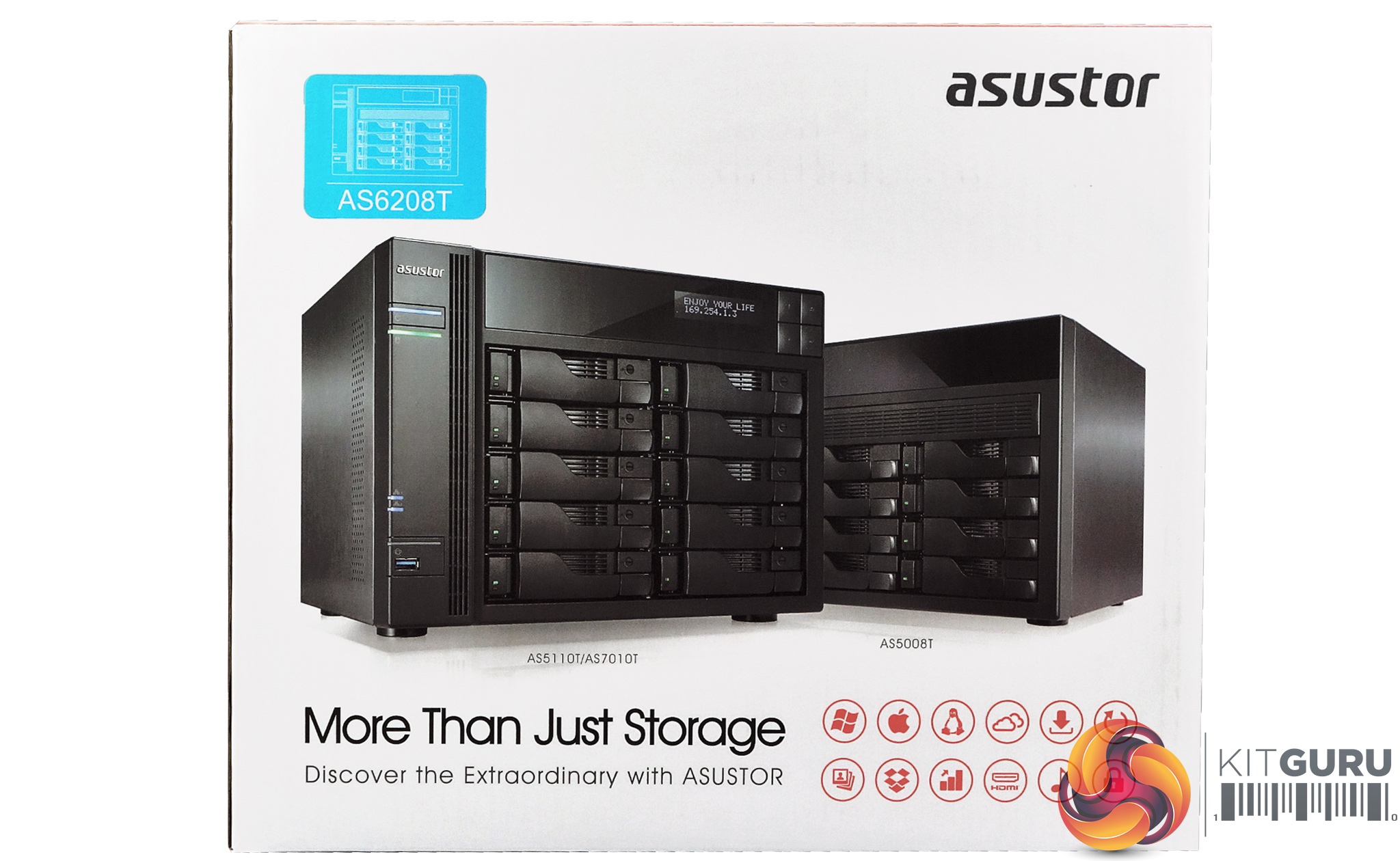 As you might imagine, an eight bay NAS ships in a rather large box. The front of the box oddly has images of the AS5008T eight bay NAS and the AS5110T/AS7010T ten bay NAS with just a sticker showing an outline image of the AS6208T.