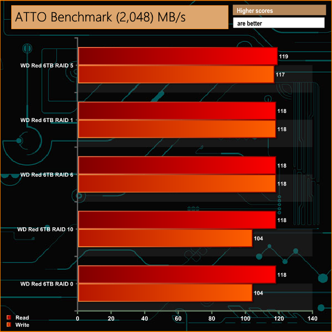Using the ATTO benchmark we could not only confirm those single port figures for RAID 5 Sequential performance but saw a very small increase on the official figures at 119MB/s for reads and 117MB/s for writes.