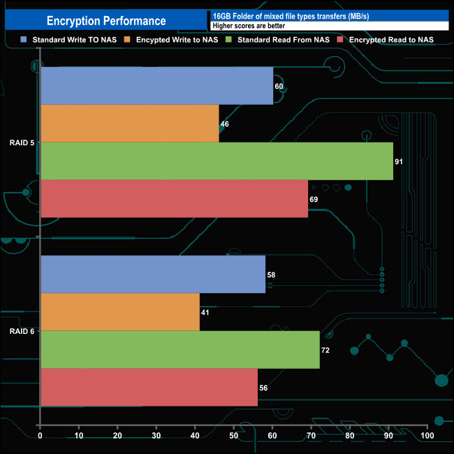 Considering the processor and with just 1GB of memory, the built-in hardware encryption engine does a decent enough good job of negating the effects of dealing with encrypted data. With the discs built into a RAID 5 array, it dropped 26MB/s when writing encrypted data to the NAS and 22MB/s when reading the data back. It's a bit more efficient when dealing with a RAID 6 array, with a 17MB/s and 16MB/s drop in writes and reads respectively.