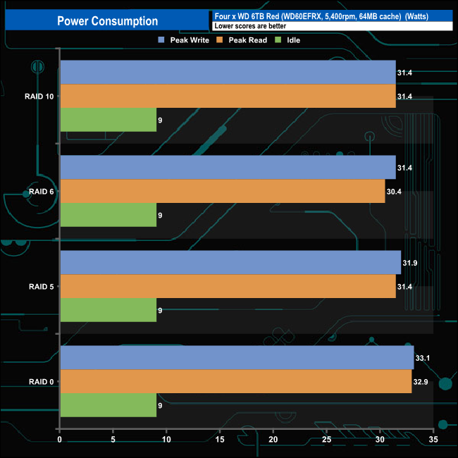 Asustor quote power consumption figures for the Drivestor 4 of 22.8W in use and 9.41W (Disk Hibernation) using WD Red 3TB drives (4.8 W active read/write, 3.1W idle and 0.4W standby and sleep). Using 6TB Red drives (WD60EFRX) we saw an average of 31.7W for active read/writes and 9W idle. The WD60EFRX is a slightly more power-hungry drive at 5.3W active and 3.4W idling.
