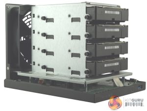 The Drivestor 4 doesn't have drive trays, the drives are directly mounted into the drive bay frame using the provided thumbscrews. This method of installation does mean that the system needs to be turned off to swap any drives in and out due to failure.