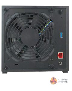 The real panel of the unit is dominated by the grill for the 120mm cooling fan (Apistek SAB4B2U-PFGE). The speed of the fan can be set either manually (low, medium or high) or auto in the ADM OS. Above this and to the right is the power button (which is a bit of an odd position for it) under which are the second USB 3.2 Gen1 port and the 2.5GbE RJ45 port.