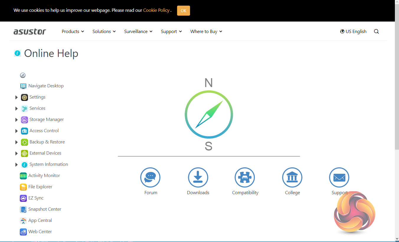 The ADM Help page has five links to various parts of the Asustor website where you can find help and advice if you have problems with the NAS. The Forum button takes you to the Asustor online forum and Downloads is a direct link to the download pages. Compatibility is a useful addition as it takes you to the Asustor Compatibility page, a very handy selection of hardware compatibility tables. Another useful link is to the Asustor College. Here you will find a collection of online easy-to-follow courses to learn all aspects of the NAS and its functions. The final link takes you directly to the Asustor online Support Center.