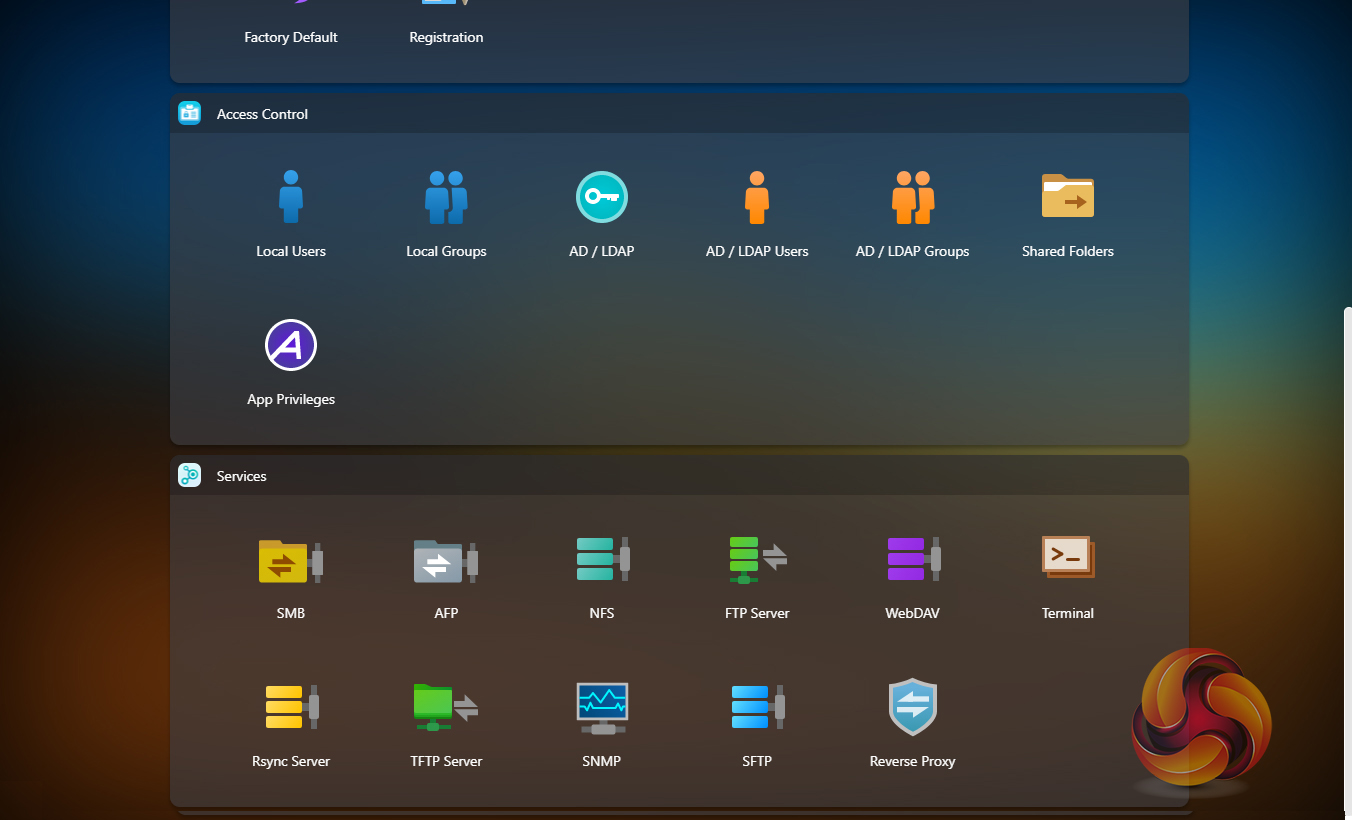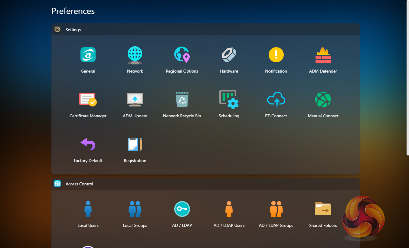 The Preference button gives you easy access to most aspects of the NAS functions. It's divided into three sections; Settings, Access Control and Services.