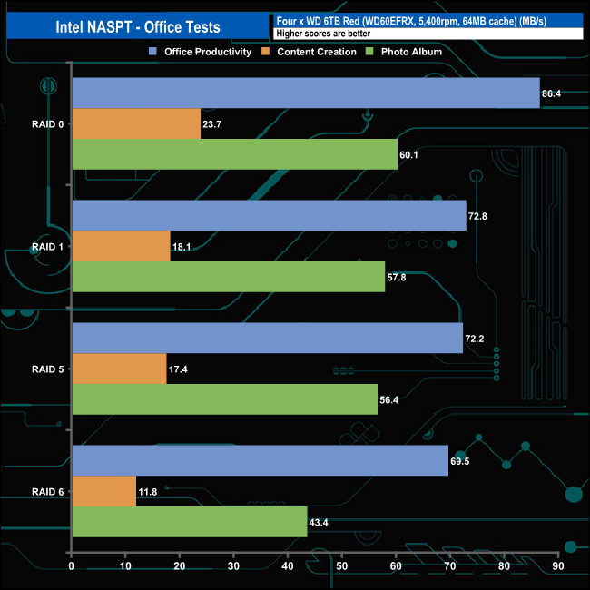 In the office tests, the NAS displayed strong performance with a pretty good consistency across the tested arrays. The strongest performance came from the Office Productivity trace with an average of 75.22MB/s. When dealing with the multitude of small files that make up the Photo Album test it averaged 54.42MB/s and the more arduous Content Creation trace produced an average of 17.7MB/s.
