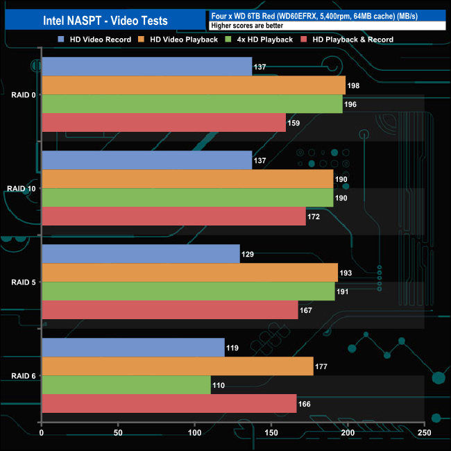 In the video tests of Intel’s NASPT benchmark, the Drivestor 4 showed strong performance breaking the 100MB/s mark for all tests, with the fastest performance, 198MB/s, coming from the HD Video Playback test trace while the drives were in a RAID 0 array.