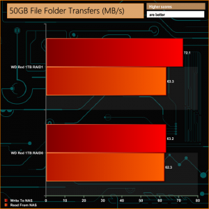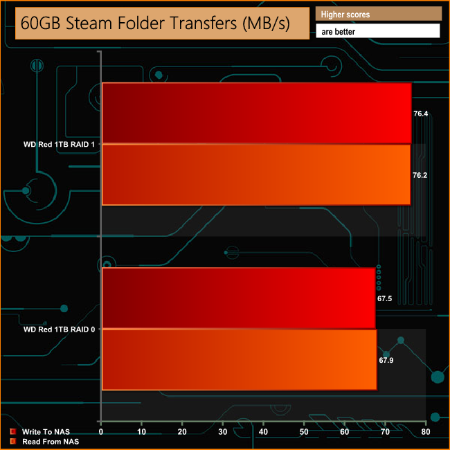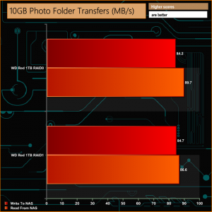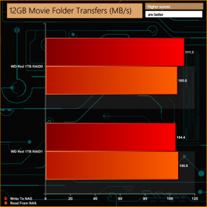 When dealing with real life data the TeraStation TS3210DN shows a good level of consistency across the arrays when handling all sorts of data. The NAS performs the fastest when dealing with the large file sizes of the 12GB Movie folder when it tops the 100MB/s barrier for all operations in both array modes.