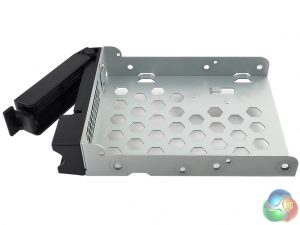 The drive bays are mounted horizontally protected by a lockable bay door, a useful bit of physical security. The drive trays are off a metal construction with the drive doors made of plastic with sliding locking latches, but unfortunately the trays are not tool free. They are, however, hot swappable.
