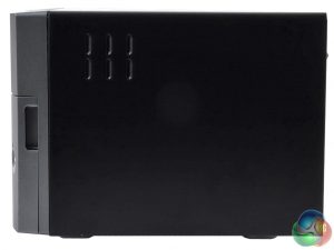 The back panel is dominated by the grill for the cooling fan. Above this is the power connector for the mains lead. Sitting below the grill are a pair of LAN ports (which support Link aggregation) next to which are a stacked pair of USB 3.0 ports.