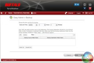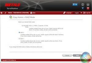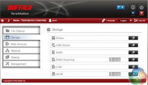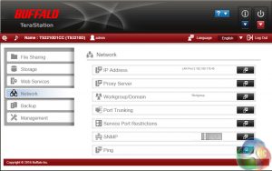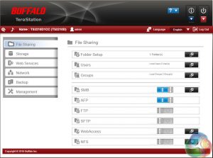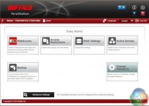 Buffalo's NAS OS has two options Easy and Advanced to use when it comes to running and maintaining the NAS. Easy Admin has six buttons on the interface to take care of most of the basic NAS functions; Access Restrictions (create users, groups and folders), RAID Settings, Active Domain (sync the TeraStation with Active Directory), WebAccess, Backup and Password Change. You can also access the Advanced Settings from here as well.
