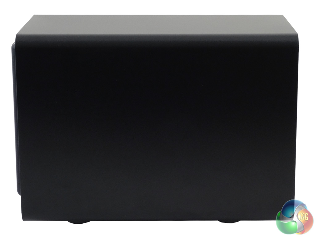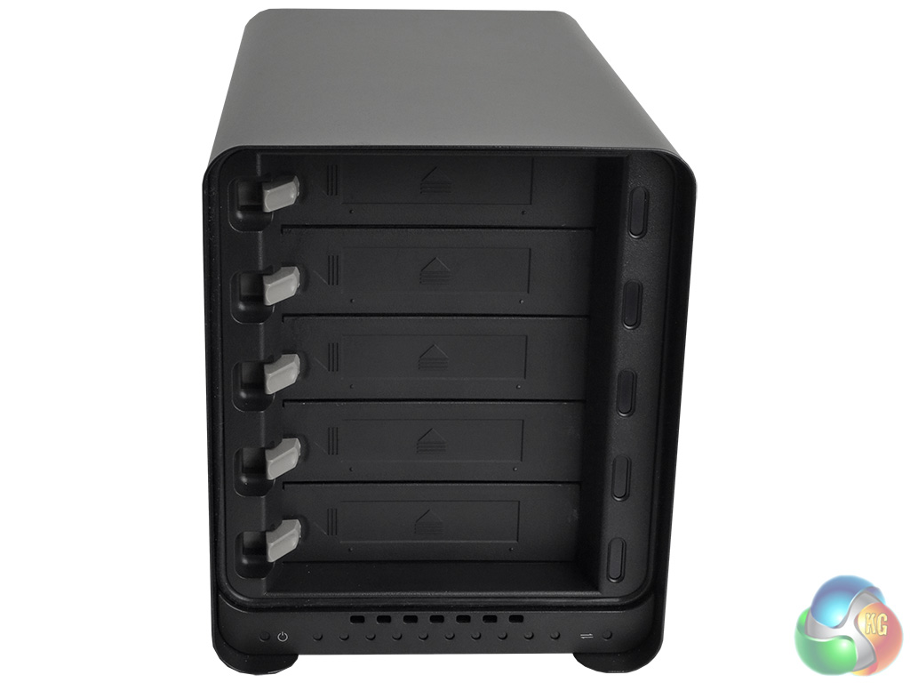 The five drive bays sit behind the detachable front plate and are tool free. The bays themselves are protected by sprung doors which are forced up and out of the way by pushing a drive into them. Each bay has a latch to hold the drive in place. There's no form of extra physical security in the way of drive bay locks etc. The bays support drives up to 8TB in capacity.