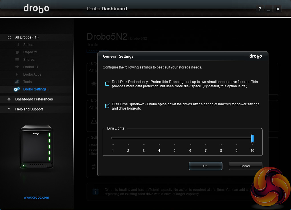 Switching from the default single disk redundancy to dual redundancy is a nothing more complicated than a single mouse click. Once again it's done on the fly and data can be accessed while the 5N2 is converting between redundancy modes.