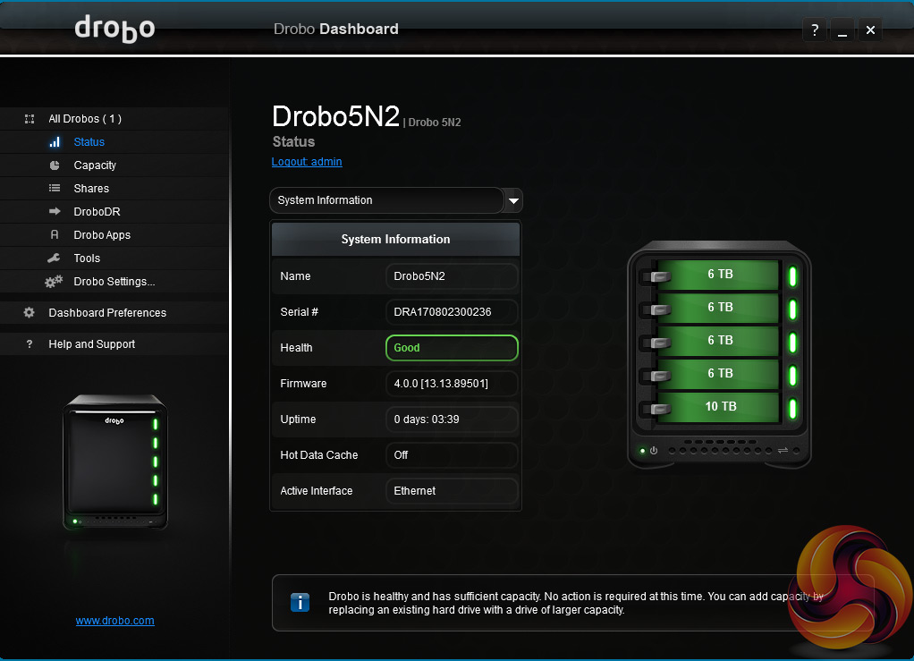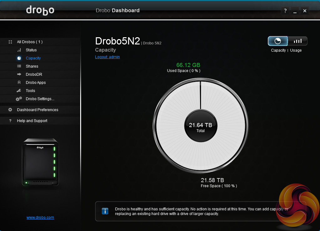 The Drobo 5N2 is really easy and straightforward to set up. Once the drives are loaded it's a matter of downloading Drobo's Dashboard OS and begin the install. Once the installation starts, the main Dashboard screen appears with an icon of the 5N2 complete with yellow alert lights. Once the install is complete, the yellow lights turn green. The whole procedure takes around 20 minutes to complete.