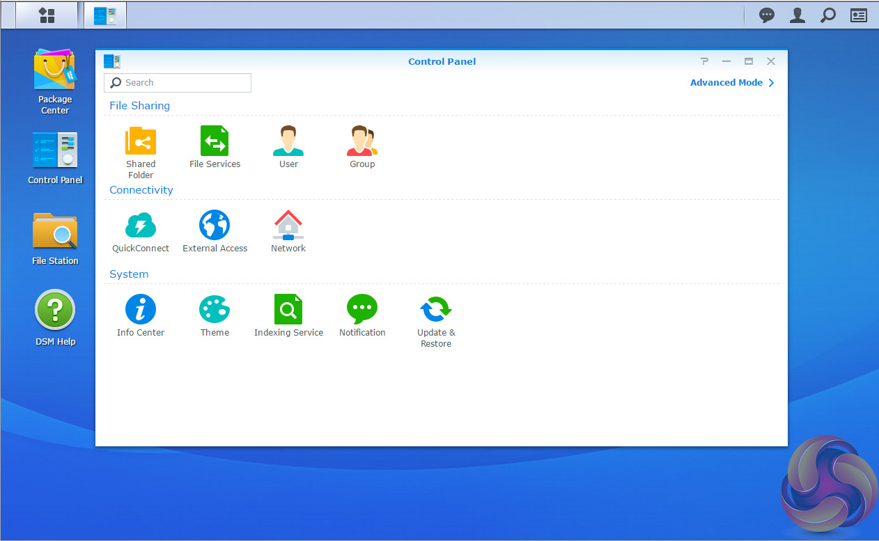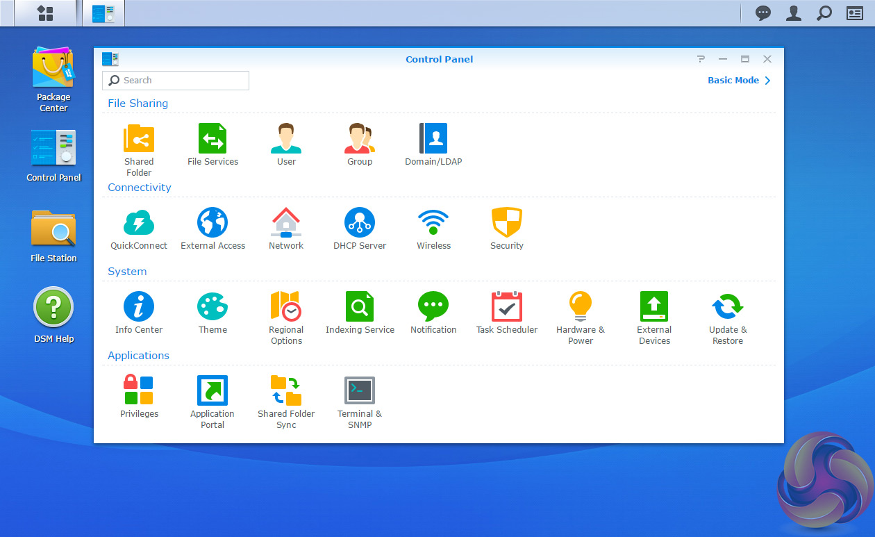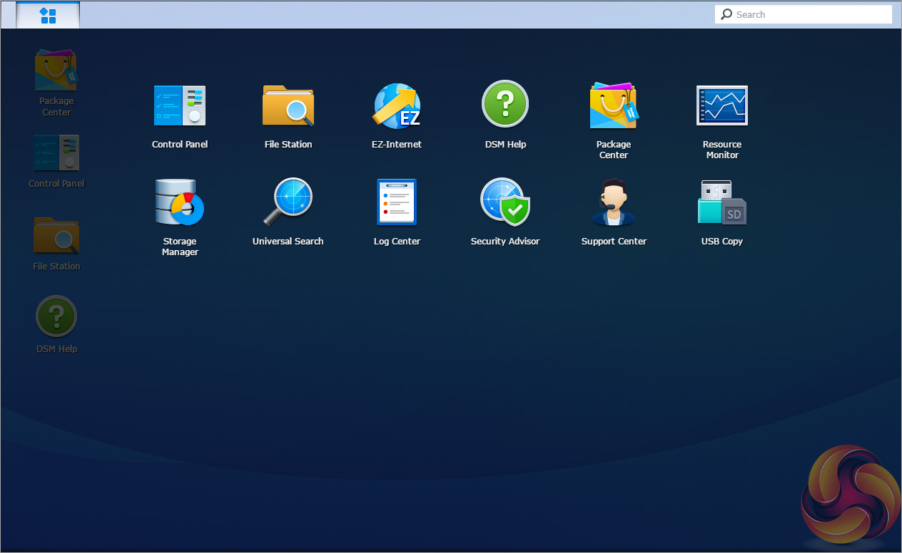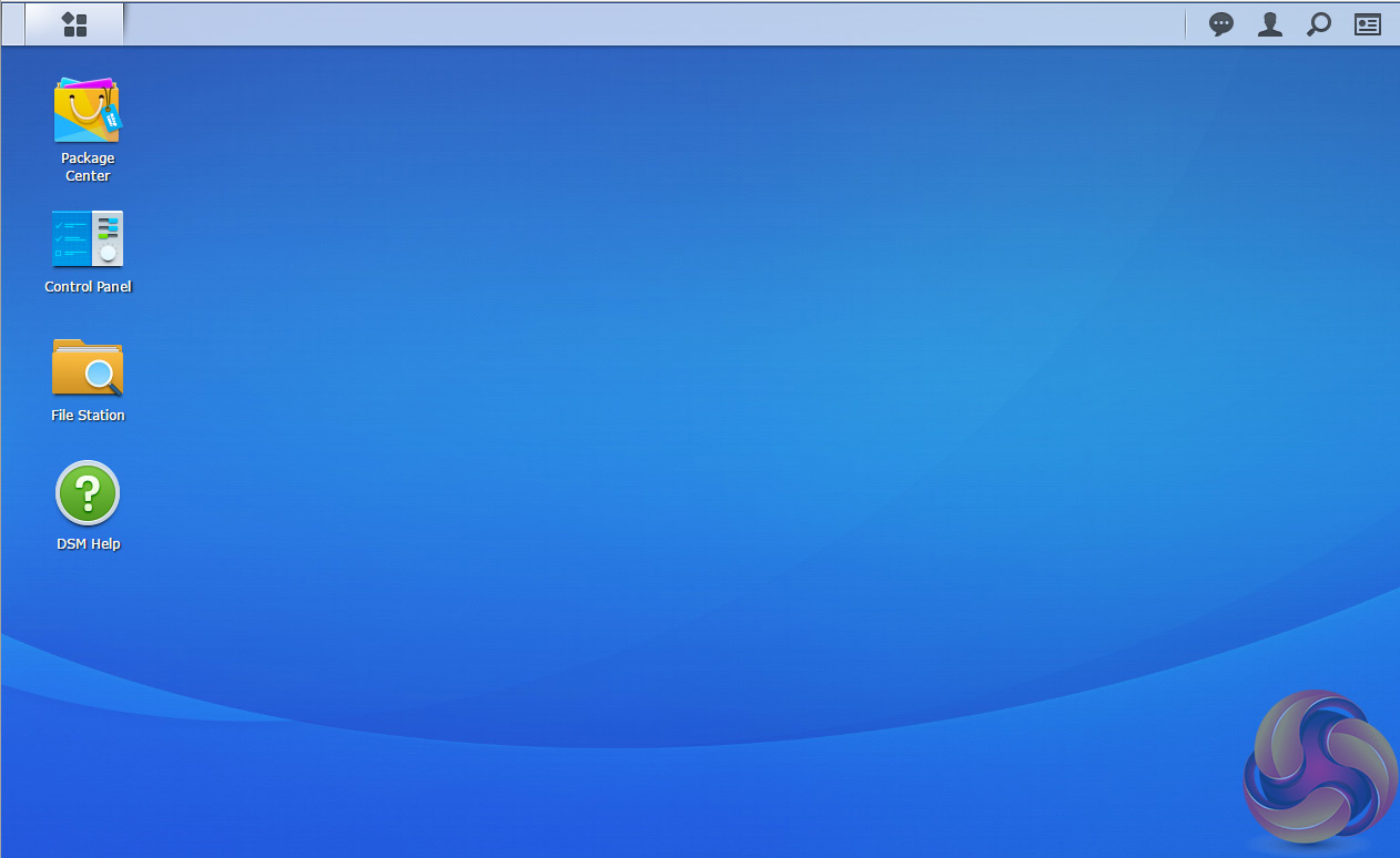 DSM has a graphically rich interface with all the major features of the OS clearly listed. The basic start page just lists four items; Package Center, Control Panel, File Station and DSM help.